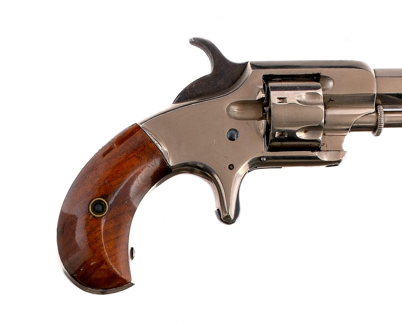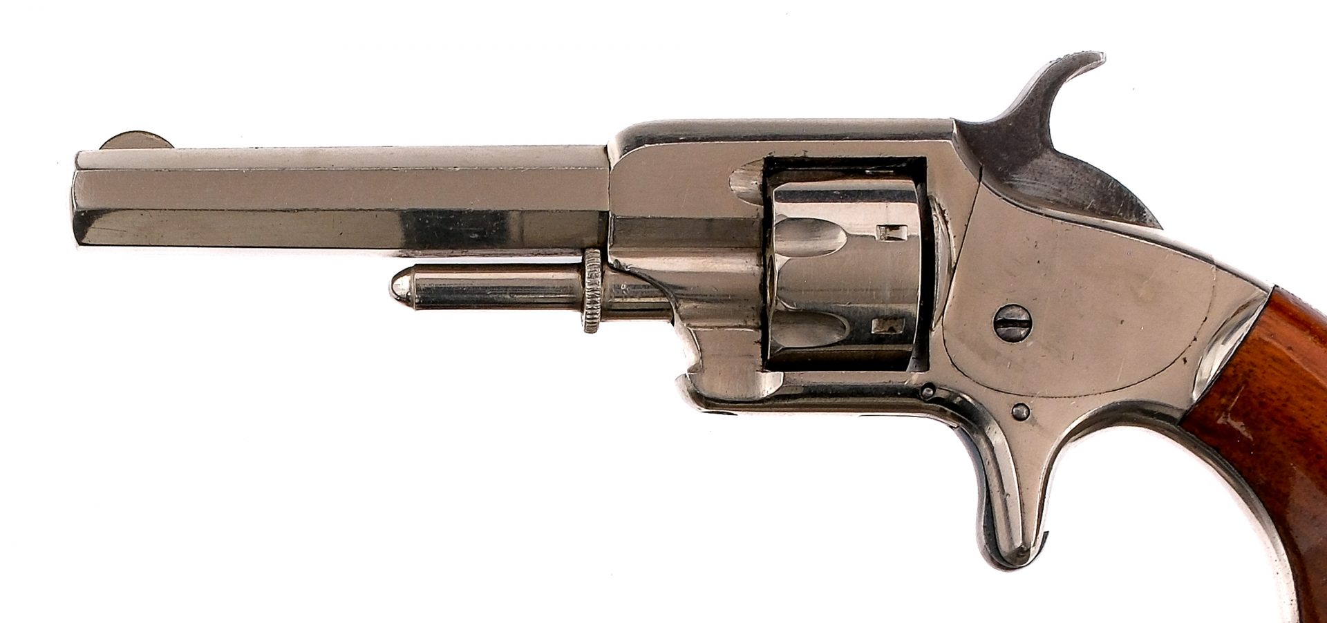Description Whitneyville Number 1 1/2 in .22 caliber rimfire with a seven round capacity and a 3″ octagon barrel. Smooth wood grip plates. Nickel finished frame, cylinder and barrel. Blued trigger and checkered hammer. Under barrel cylinder release pin. Front and rear fixed sights. Antique, No FFL required and ships to MOST buyers homes. Condition: Antique, Very Good with light scratches, tiny touches of and handling wear. Clean rifled bore. Barrel Length: 3″ Serial: 32751 Manufacturer: Whitneyville Armory Caliber: .22 Model: 1 1/2