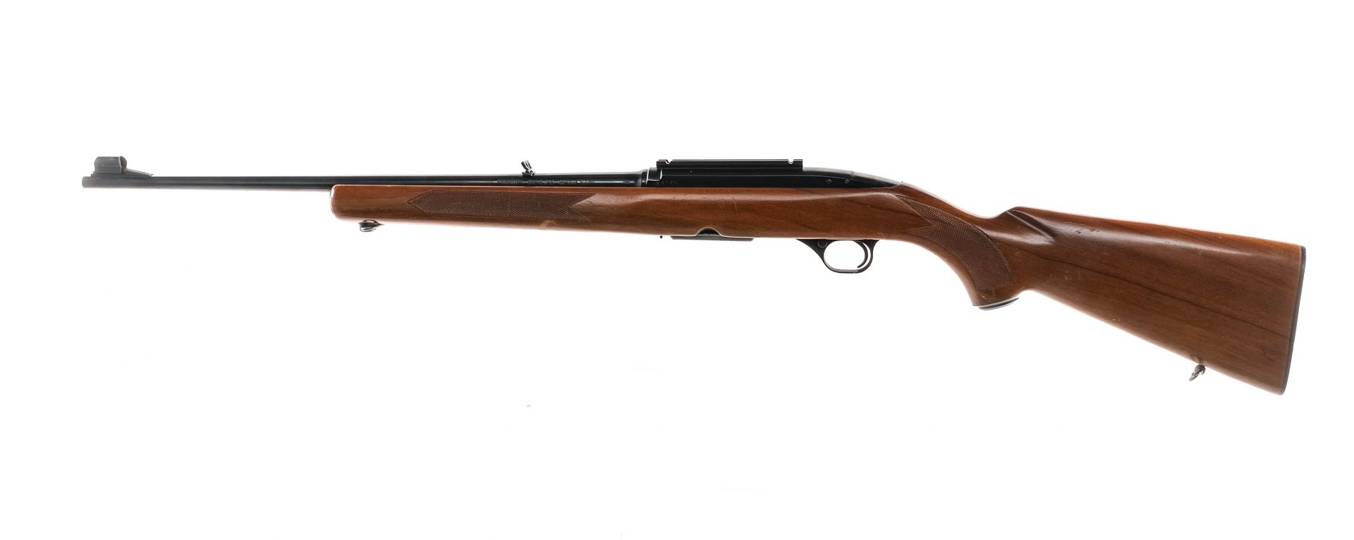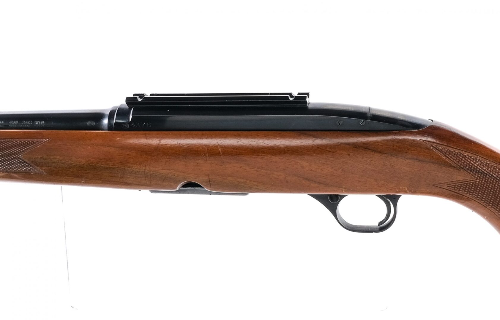 Description Winchester Model 100 in .308 Winchester with one, four round removable magazine and a 22″ barrel. Checkered composite butt plate. Checkered wood stock and front forend. Blued trigger guard, serrated trigger, receiver, serrated charging handle and barrel. Front trigger guard push button safety. Magwell located magazine release. Rear flip up adjustable and front hooded fixed blade sight. Receiver mounted optics rail. Metal loops for mounting a shoulder sling. Must ship to a C&R or FFL holder. Condition: Good/Very Good with light scratches, small spots of rust and handling wear. The rifled bore has a very light touch of rust with strong visible rifling. Barrel Length: 22″ Serial: 4376 Manufacturer: Winchester Caliber: .308 Win Model: 100 Year-Range 1961-1973 Book# 01393