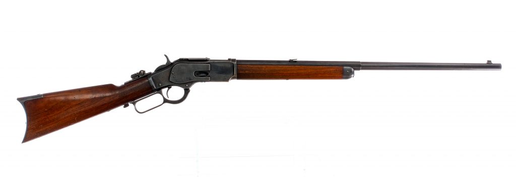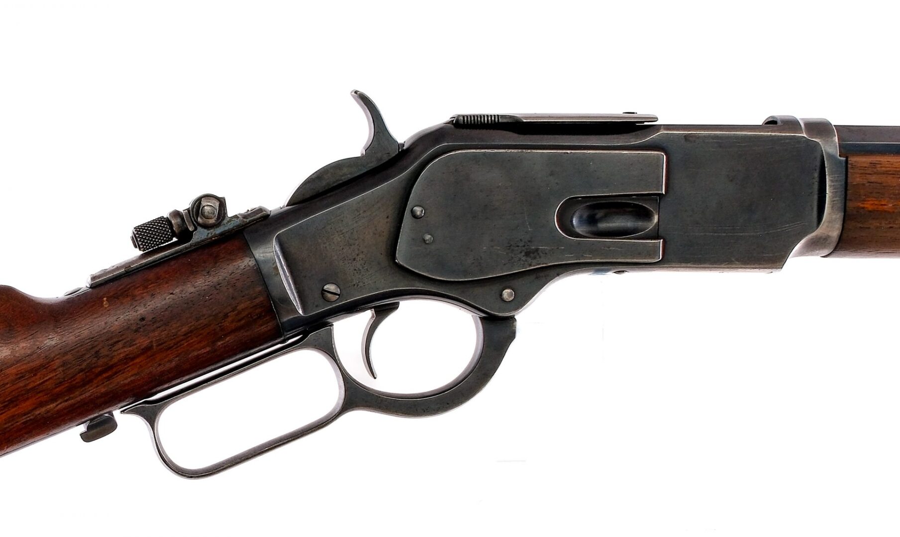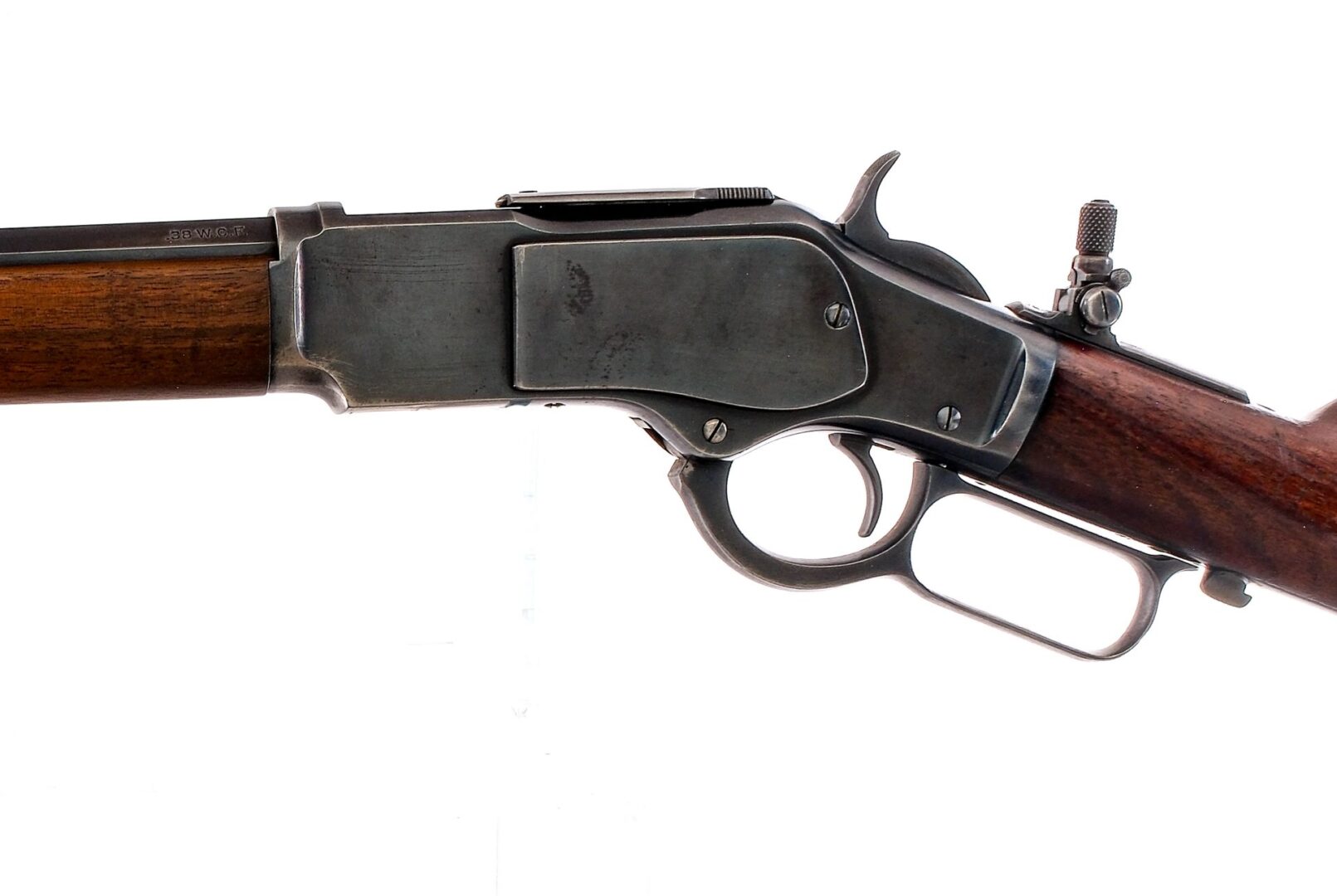 Description UPDATE: Barrel has dent about 7″ from the muzzle. Winchester Model 1873 Third Model in .38 Winchester Centerfire with a five round capacity and a 24″ half octagon/round barrel. Blued metal butt plate with cleaning rod door, empty. Smooth wood stock and front forend. Blued hand lever, trigger, checkered hammer, receiver and barrel. Mid barrel flip up and front fixed blade sight. Receiver tang located flip up adjustable peep hole sight. Antique, No FFL required and ships to MOST buyers homes. Condition: Antique, Very Good with scratches, finish wear/loss and touches of rust. A small square cutout and repair to the underside of barrel. 3.5″ bellow muzzle. Clean rifled bore. Barrel Length: 24″ Serial: 149145A Manufacturer: Winchester Year: 1884 Caliber: .38 WCF Model: 1873
