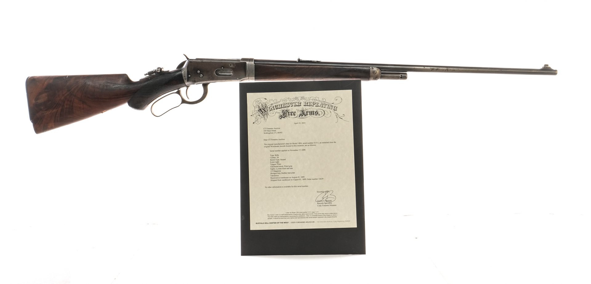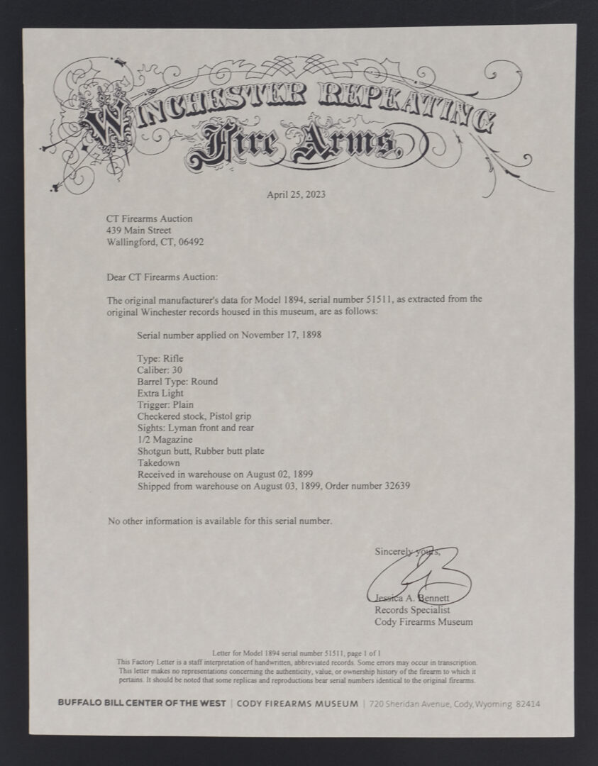Description Winchester 1894 Take-Down in .30 W.C.F. (Winchester Center Fire) which is .30-30 caliber with a four round capacity and a 26″ barrel. Checkered composite butt plate. Blued hand lever, trigger, checkered hammer, receiver, magazine tube and barrel. Checkered wood stock and front foregrip. Mid-barrel flip up and front fixed blade sight. Rear receiver tang located adjustable peep hole sight. Take-Down lever under barrel. Comes with Cody Firearms Museum Letter from the Records Specialist confirming current configuration. Antique, No FFL required and ships to buyers home. Condition: Very Good with finish wear/loss, metal pitting on the barrel and damage to the butt plate. The rifled bore has light rust with strong visible rifling. Barrel Length: 26″ Serial: 51511 Manufacturer: Winchester Year: 1898 Caliber: .30 WCF Model: 1894 Take Down