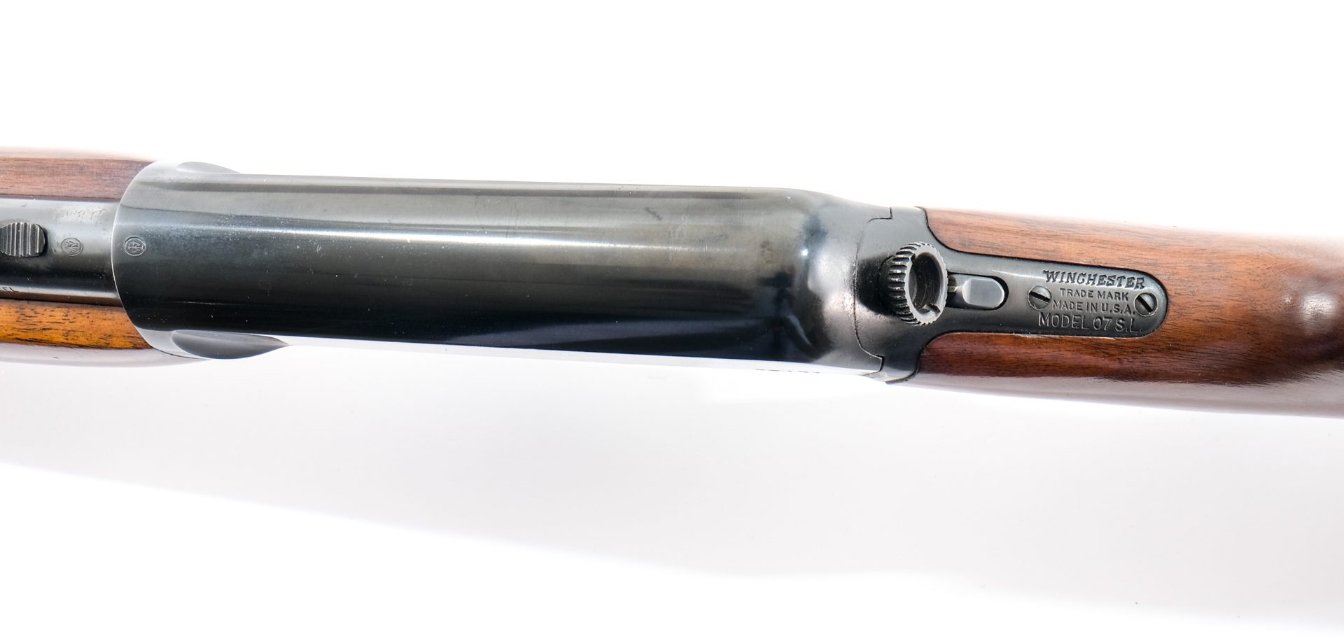 Description Winchester 1907 S.L. (07 Self Loading) Take-Down rifle in .351 SL with one, five round removable magazine with a 20″ barrel. Serrated metal butt plate. Hardwood smooth stock and front foregrip. Blued receiver, trigger, guard, magazine, charging handle and barrel. Trigger guard located checkered push button safety. Right side of magwell located magazine release. Rear receiver Take-Down screw, with this removed the rifle breaks down for easier transport. Adjustable rear sight and front fixed blade. Metal loops for mounting a shoulder strap. WP (Winchester Proof) marked receiver and barrel. Must Ship to FFL or C&R holder