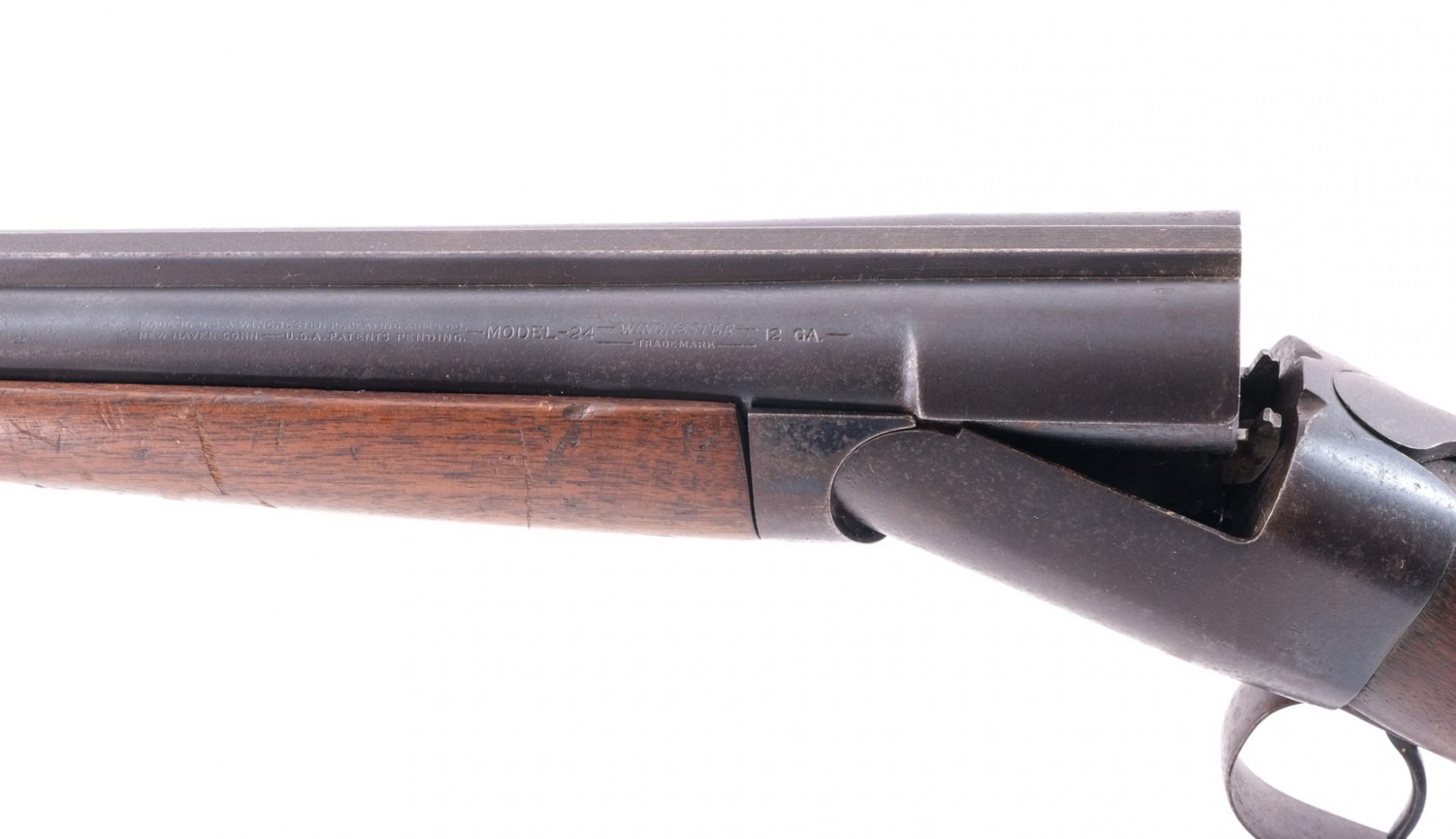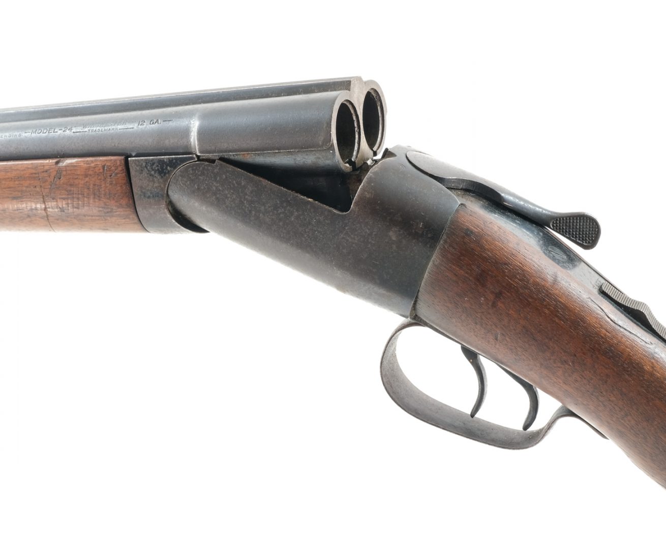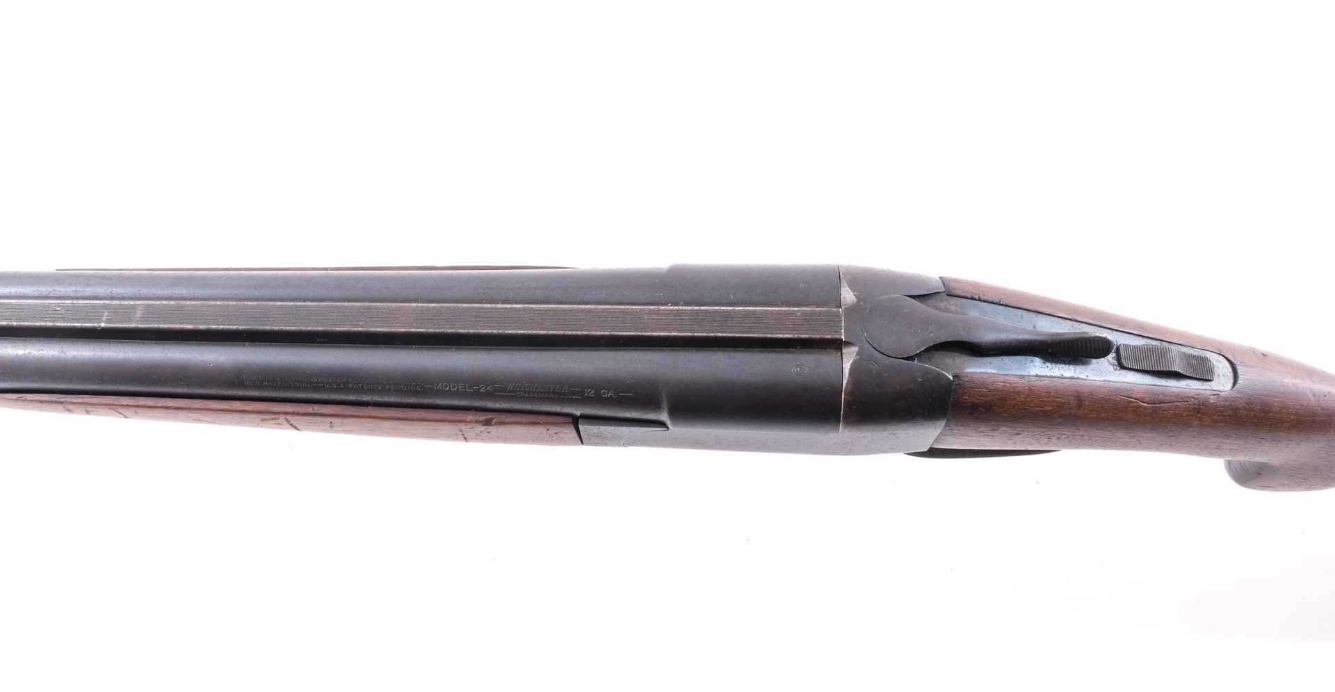 Description Winchester Model 24 in 12 gauge with a two round capacity with 30″ barrels. The left barrel has FULL and the right ,MOD fixed chokes. Pachmayr White Line rubber butt pad. Smooth wood stock and front foregrip. Blued receiver, double smooth triggers, guard, top lever and double barrels. Rear receiver serrated slide button safety. Aftermarket Burndy plastic loops for mounting a shoulder sling. Must ship to a C&R or FFL holder.