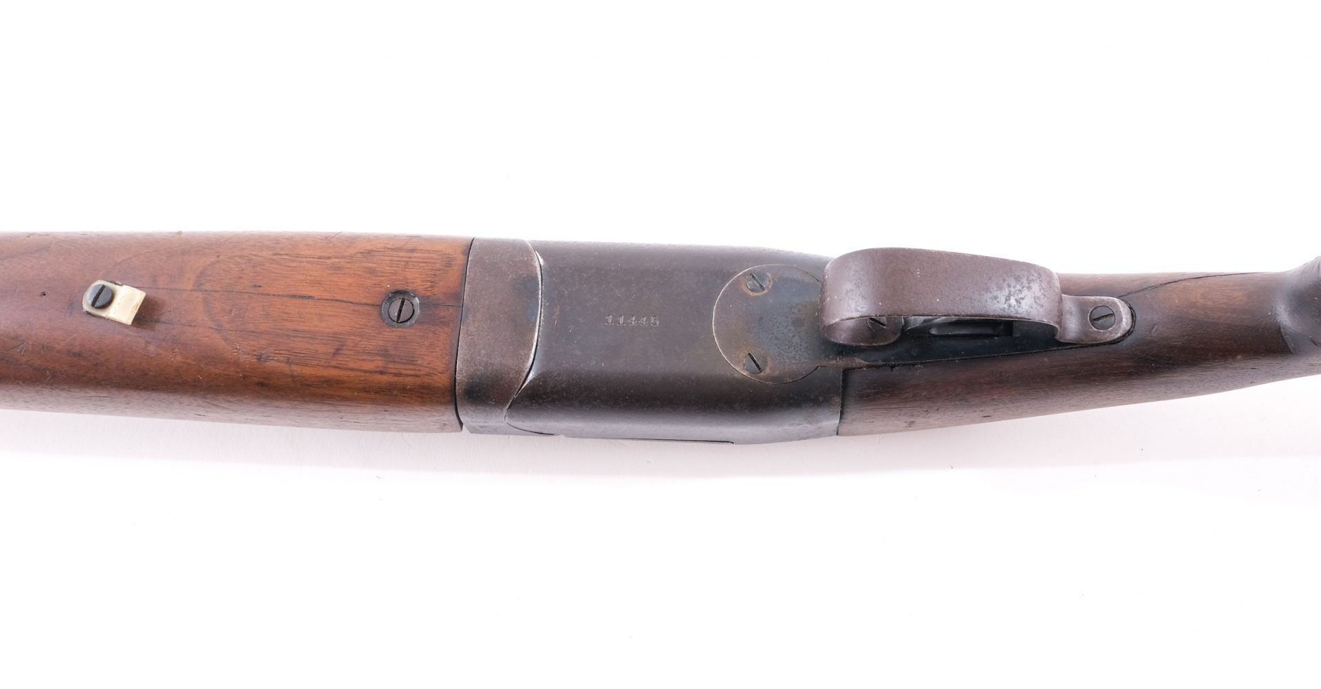 Condition: Poor with scuffs, scratches, heavy handling wear and metal oxidation throughout. The wood stock is cracked where it meets the receiver. The wood foregrip is cracked on the underside. The butt pad doesn’t fit properly. The smooth bores have some pitting.