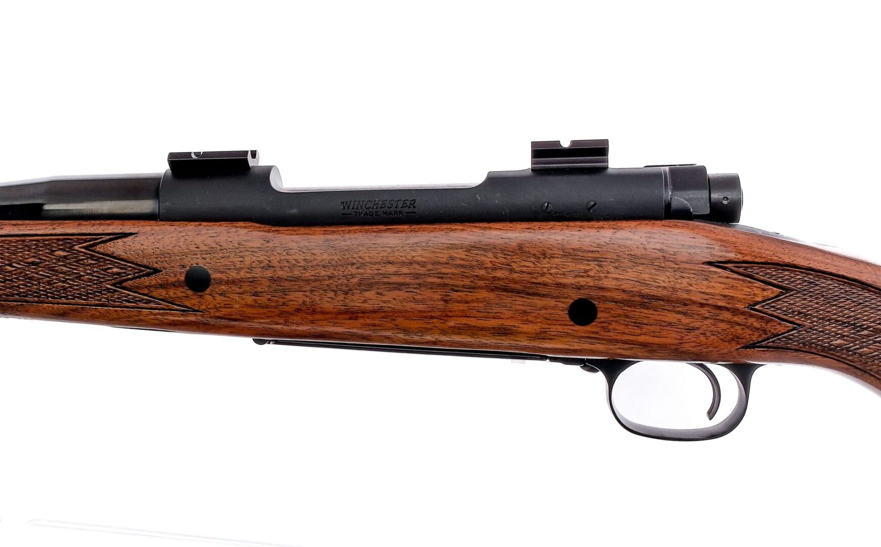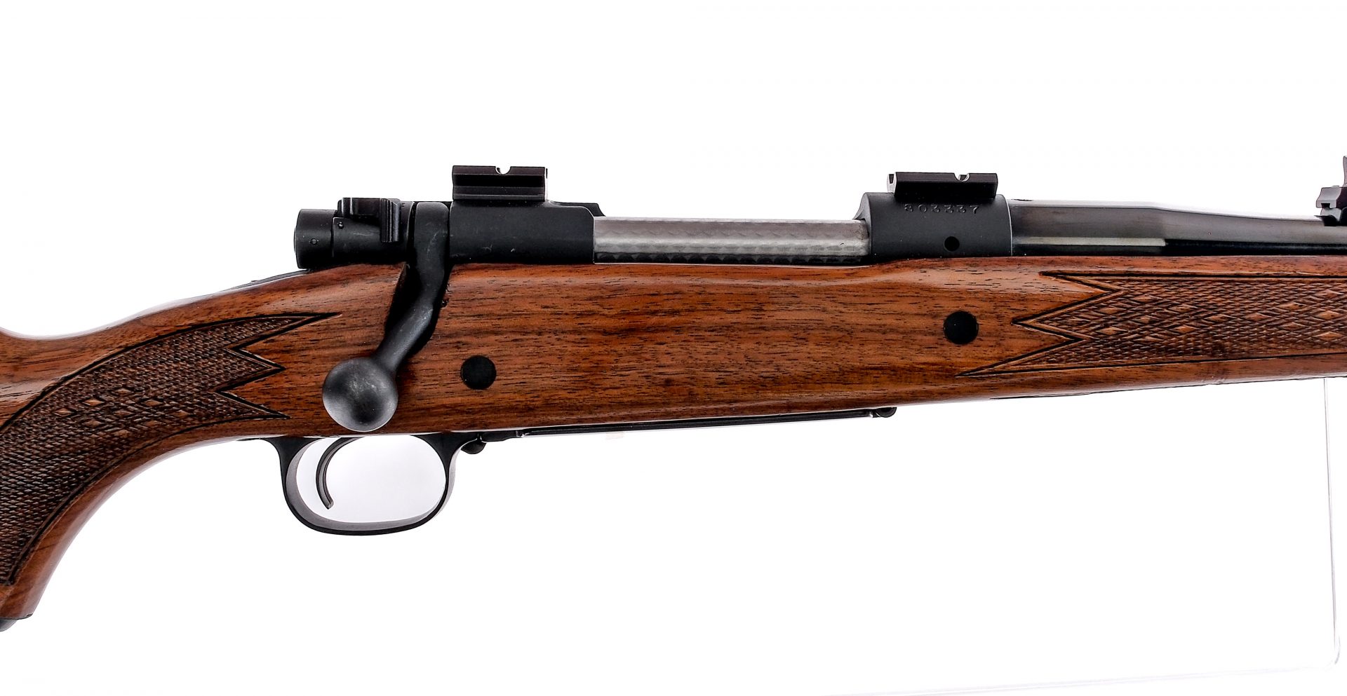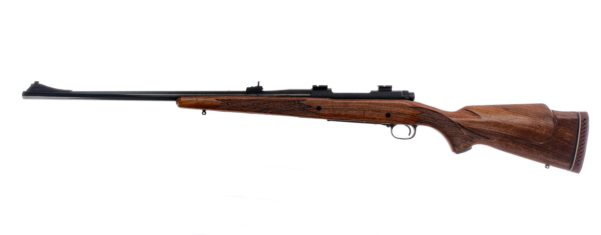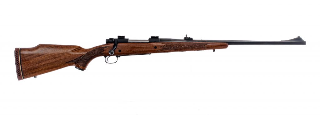 Description Winchester Model 70 Safari Express in .375 Holland & Holland Magnum with a five round capacity and a 24″ barrel. Rubber butt pad. Checkered Monte Carlo style wood stock and front forend. Blued Trigger guard, serrated trigger, receiver, bolt handle and barrel. Jeweled bolt body. Rear bolt safety switch. Rear left side of receiver bolt release. Top of receiver has optics mounts. Rear adjustable and front fixed blade sight. Must ship to a C&R or FFL holder. Condition: Very Good with light scuffs and handling wear. Clean rifled bore. Barrel Length: 24″ Serial: 803337 Manufacturer: Winchester Year: 1965 Caliber: .375 H&H Mag Model: 70 Safari Express Book# 03132