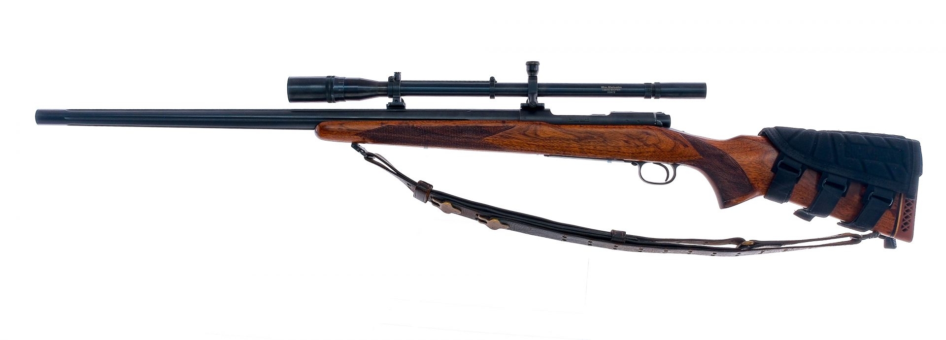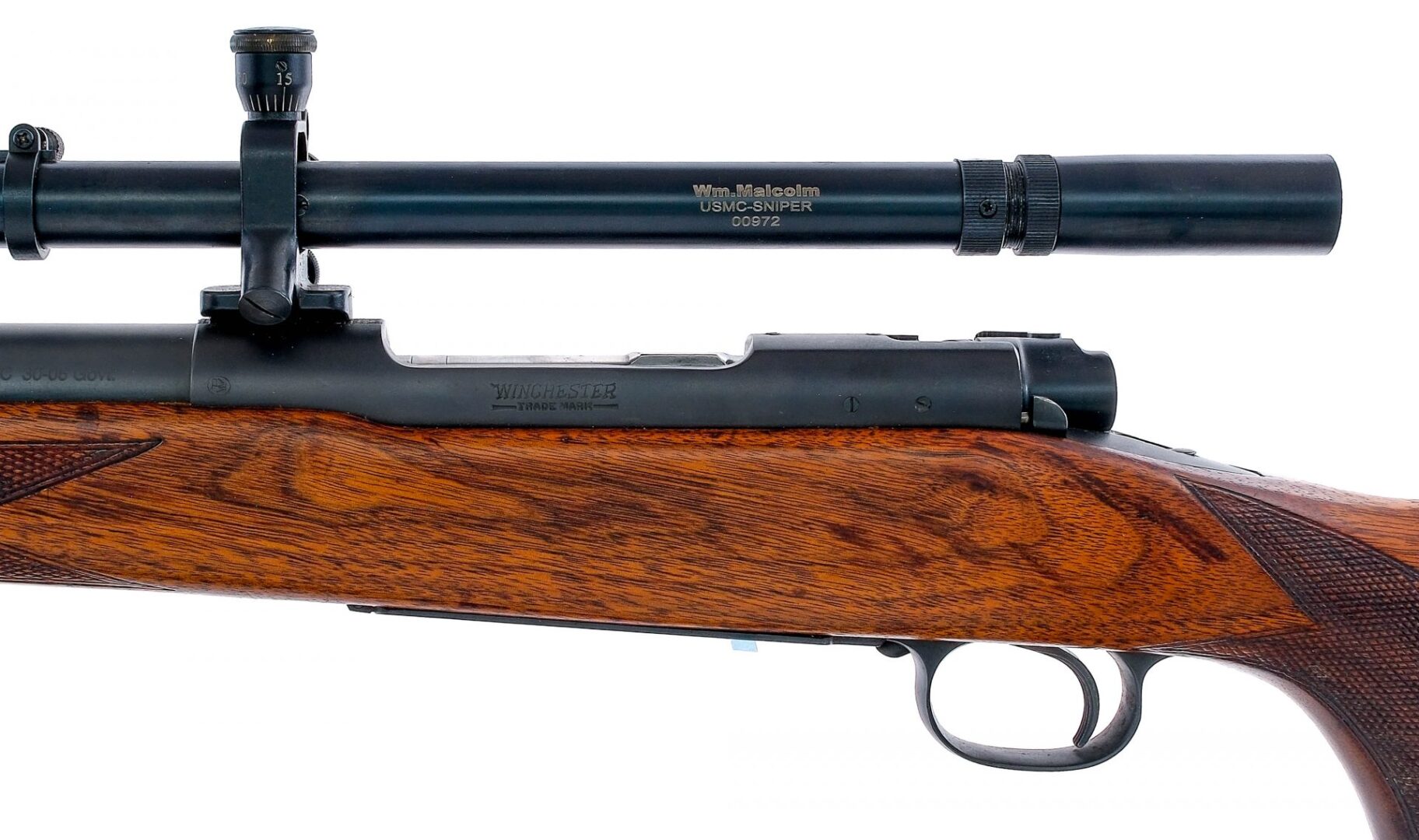 Description Winchester 70 United States Marine Sniper Carlos Hathcock replica in .30-06 Government with a five round capacity and a 25.5″ fluted barrel. 1955 dated receiver. Rubber butt pad. Checkered wood stock and front forend. Blued trigger guard, serrated trigger, receiver, bolt and barrel. Rear bolt safety switch. Rear left side of receiver bolt release. No fixed sights, mounted with a 8x Power Wm. Malcom USMC-Sniper scope # 00972 with clear glass and a duplex reticle. Fluted barrel marked: U.S.M.C. 30-06 GOVT. Mounted with a vintage leather and brass shoulder sling and a Blackhawk nylon extra round holder on stock. Must ship to a C&R or FFL holder. Condition: Good with parts being refinished/replaced barrel, touches of surface rust and handling wear. Clean rifled bore. Barrel Length: 25.5″ Serial: 353850 Manufacturer: Winchester Year: 1955 Caliber: .30-06 Govt Model: 70 Sniper Book# 03622