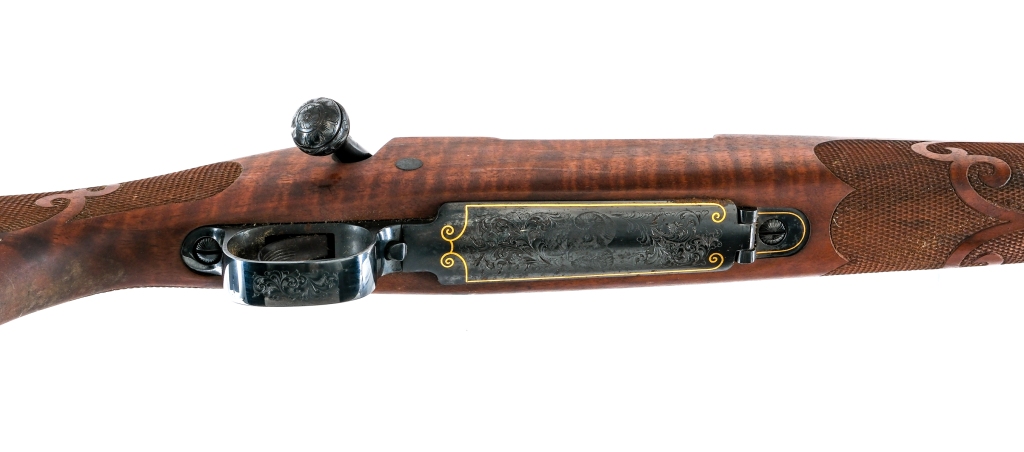 Description Winchester Model 70 Ultra Grade 1 of 1000 in .270 Winchester with a five round capacity and a 22″ tapered barrel. Made in New Haven Connecticut between 1982 and 1983 with serial number UG 89. Rubber butt pad. Checkered fine figured walnut stock and Schnabel style front forend. Blued trigger guard, serrated trigger, receiver, bolt handle and barrel. Gold inlays around the muzzle end of barrel, receiver, rear of barrel and magazine floor plate. Jeweled bolt body. Engraved pistol grip cap, trigger guard, magazine floor plate, bolt handle and receiver. Engraved and signed on the top rear of receiver by Bottega C. Giovanelli. Rear bolt safety switch. Rear left side of receiver bolt release. No fixed sights. Metal eyelets and loops for mounting a shoulder sling. Must ship to a FFL holder. Condition: Good with spots of rust and handling wear. Clean rifled bore. Barrel Length: 22″ Serial: UG89 Manufacturer: Winchester Caliber: .270 Win Model: 70 Ultra Grade 1 of 1000 Year-Range 1982-1983 Book# 05746