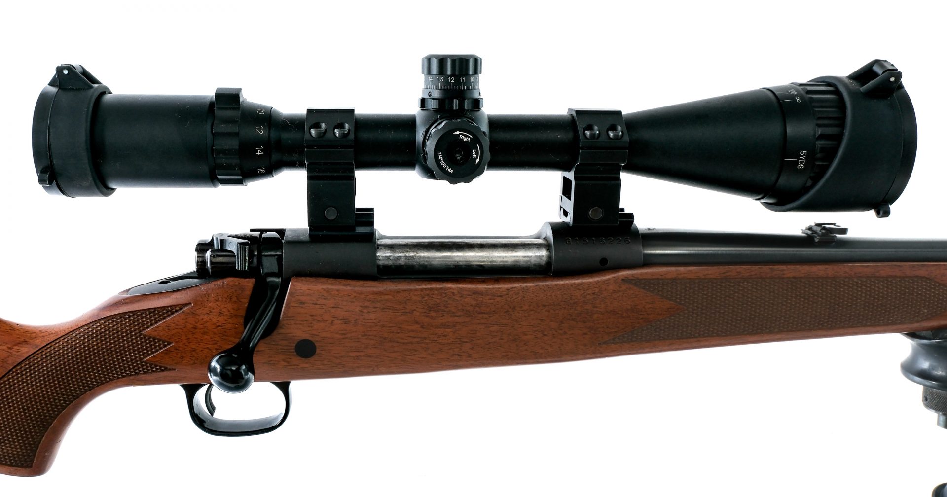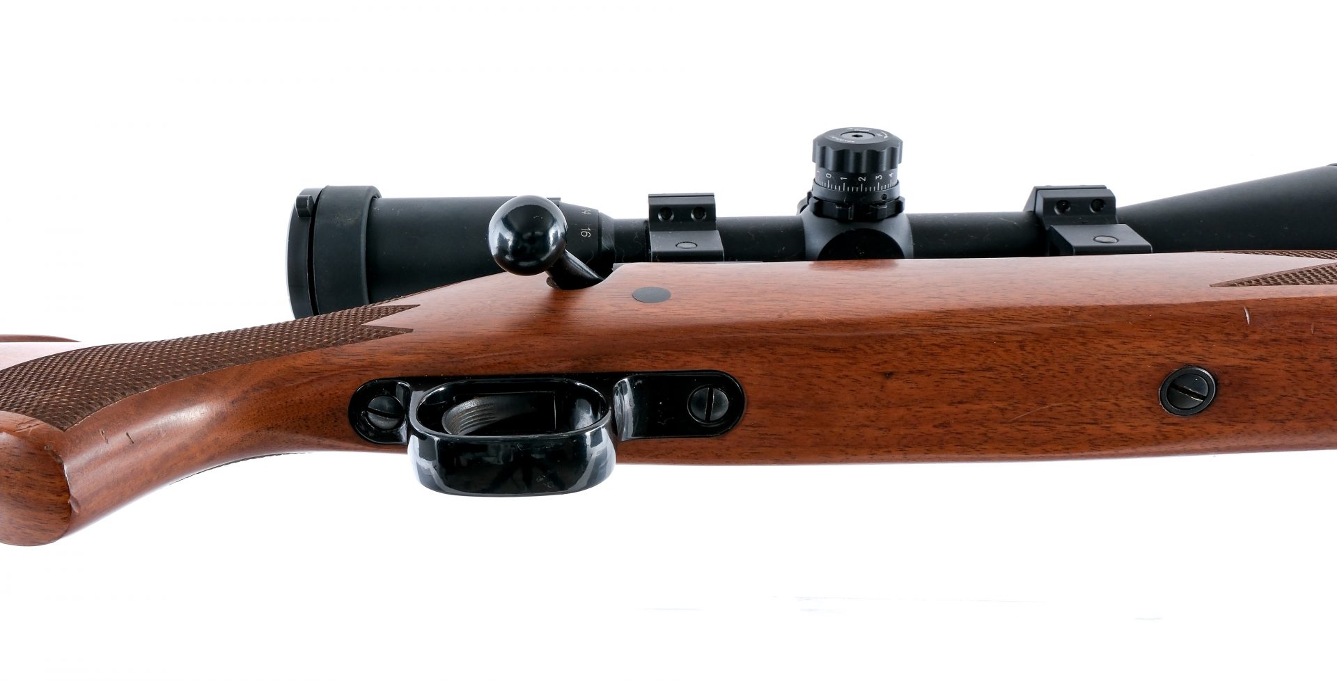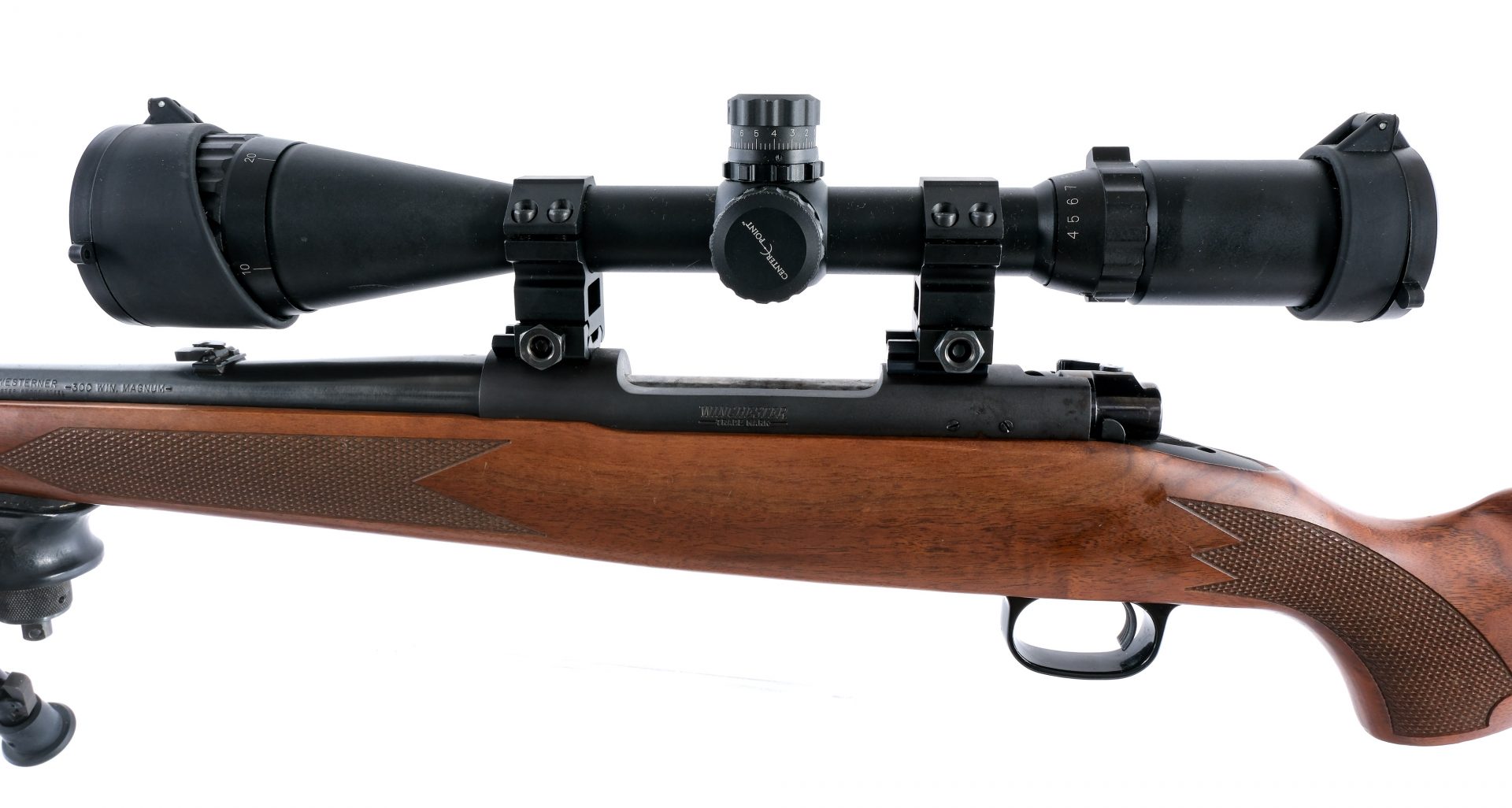 Description Winchester 70 chambered in .300 Winchester Magnum with a three round integral magazine and a 24″ barrel. Blued barrel, matte receiver, bolt handle, and trigger. Jeweled bolt body. Flip up adjustable rear and fixed front blade iron sights. The receiver is drilled and tapped and mounted with a Center Point scope. Walnut stock with checkered forend, checkered pistol grip, and rubber butt pad. Front and rear sling eyelets. Front bipod mount, comes with two Versa-Pod bipods. Comes in a black hardcase. Must ship to a FFL holder. Condition: Very Good with light scratches and cosmetic handling wear. Light wear on the moving parts from operation. Clean rifled bore. Barrel Length: 24″ Serial: G1516226 Manufacturer: WINCHESTER Caliber: .300 Winchester Magnum Model: 70 Book# 05419
