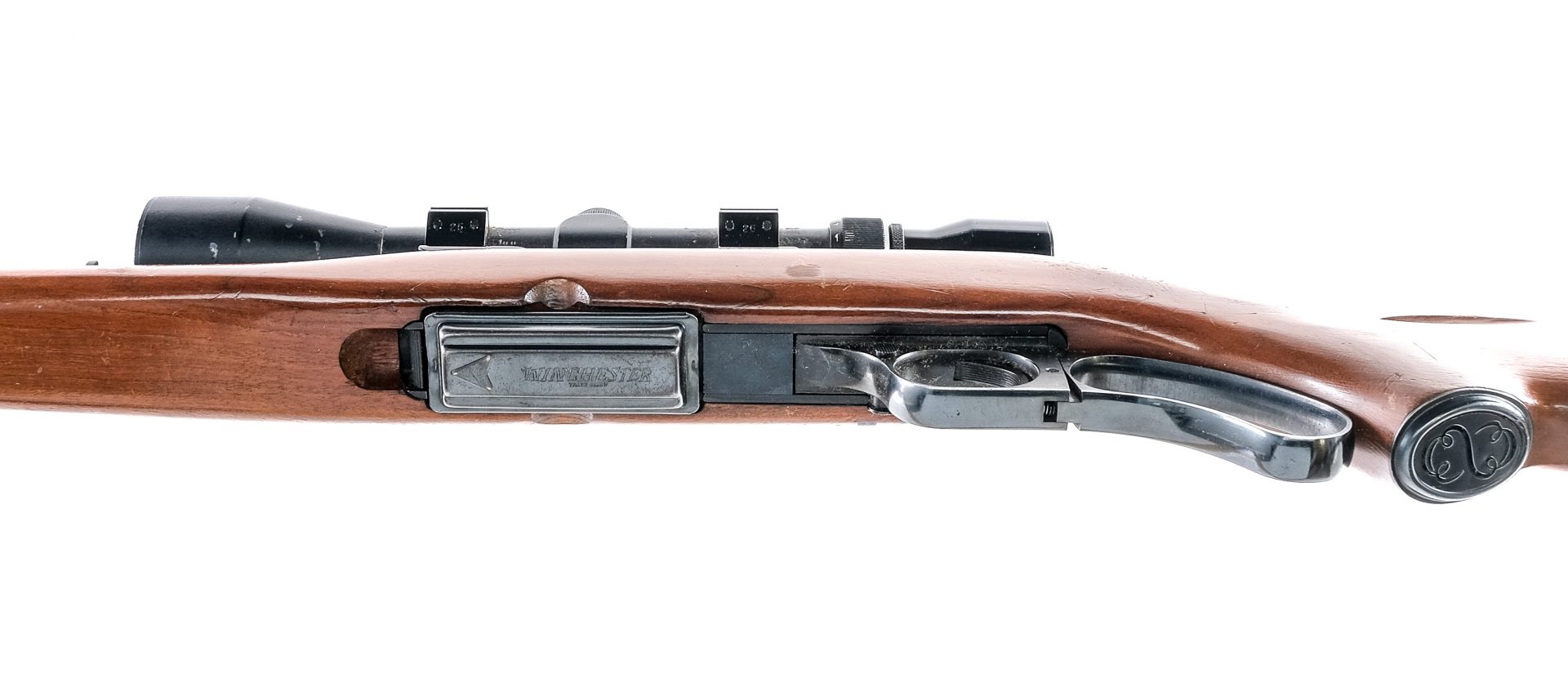 Description Winchester 88 chambered in .308 Winchester with one removable magazine and a 18.5″ barrel. Blued barrel, receiver, lever, serrated trigger, magazine release, and cross bolt safety selector. The receiver is drilled and tapped and mounted with a Tasco 3x-9×40 scope with clear and intact glass. Rear flip up sight and front hooded blade. Smooth wood stock with rubber butt pad and front and rear sling swivels. Comes with a leather sling. Must ship to FFL or C&R holder. Condition: Good with light scratches and handling wear. Light metal oxidation on the bolt. The wood has varying scratches, scuffs, and dings. The bore has some light rust to it with good visible rifling. Barrel Length: 22″ Serial: H228176A Manufacturer: WINCHESTER Caliber: .308 Winchester Model: 88 Book# 01878