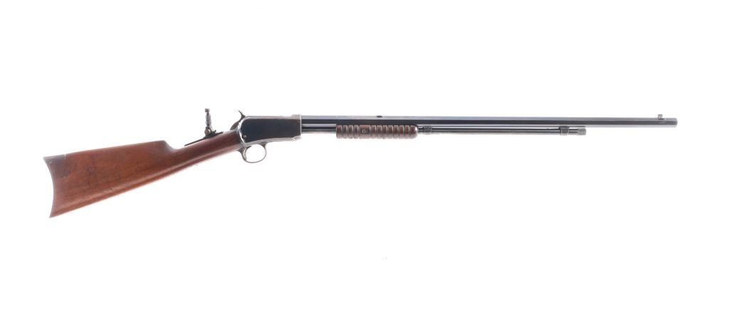 Description Winchester Model 90 Take-Down in .22 Long Rifle with a twenty two round capacity and a 24″ barrel. Contoured metal butt stock. Smooth wood stock and serrated front foregrip. Blued trigger guard, untextured trigger, checkered hammer, receiver, magazine tube and barrel. Left side of receiver located take-down screw. Under barrel checked magazine tube knob. Rear barrel sight has been removed. Comes tang mounted with a Gladstone marked adjustable peep hole sight. Must ship to a C&R or FFL holder. Condition: Good/Very good with scratches, wood dings, finish wear/loss and tiny touches of metal oxidation. Clean rifled bore. Barrel Length: 24″ Serial: 302872 Manufacturer: Winchester Year: 1907 Caliber: .22 S L LR Model: 90