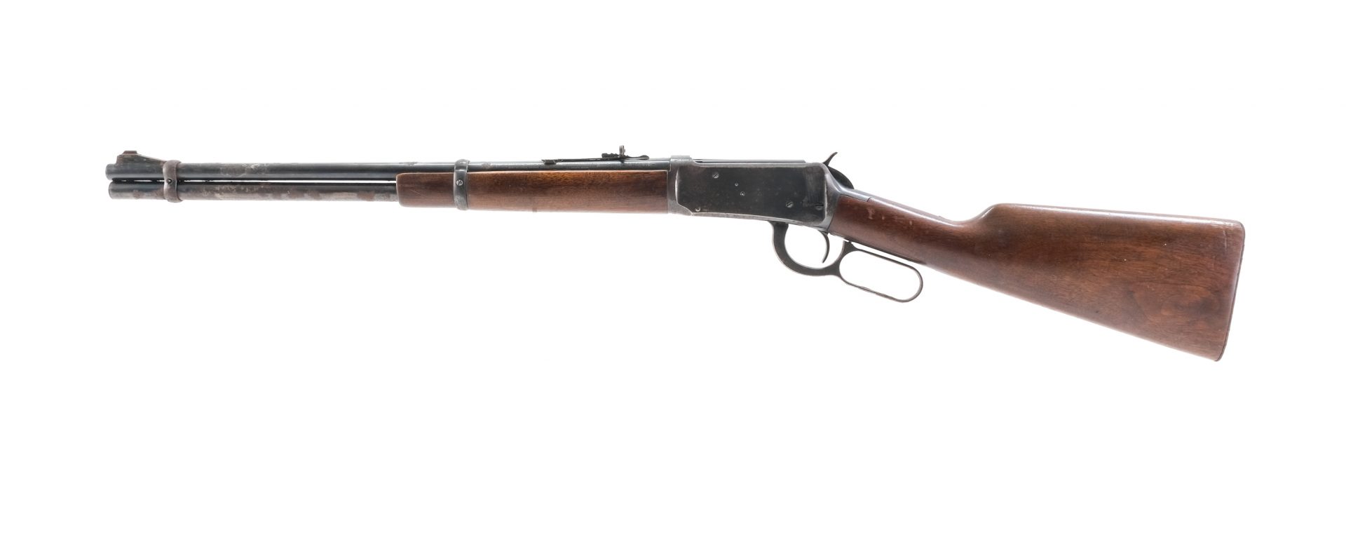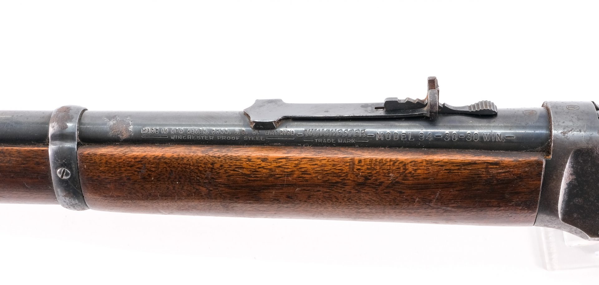 Winchester model 94 in .30-30 with a seven round capacity and a 20″ barrel. Metal butt plate with moderate metal oxidation and light wear. Wood butt stock, finish wear on the butt, small dings and scratches throughout. Receiver, heavy finish wear, scuffs, scratches and metal oxidation. Lever and trigger assembly, touches of metal oxidation and finish loss. Foregrip heavy handling wear, scuffs, dings and clearcoat finish loss. Barrel and magazine tube, heavy finish loss, metal oxidation and scratches. Rear adjustable and front fixed blade sight, light metal oxidation, does not effect function. Very clean rifled bore and tight lever action. This lever action rifle must ship to a C&R or FFL holder. SOLD AS-IS