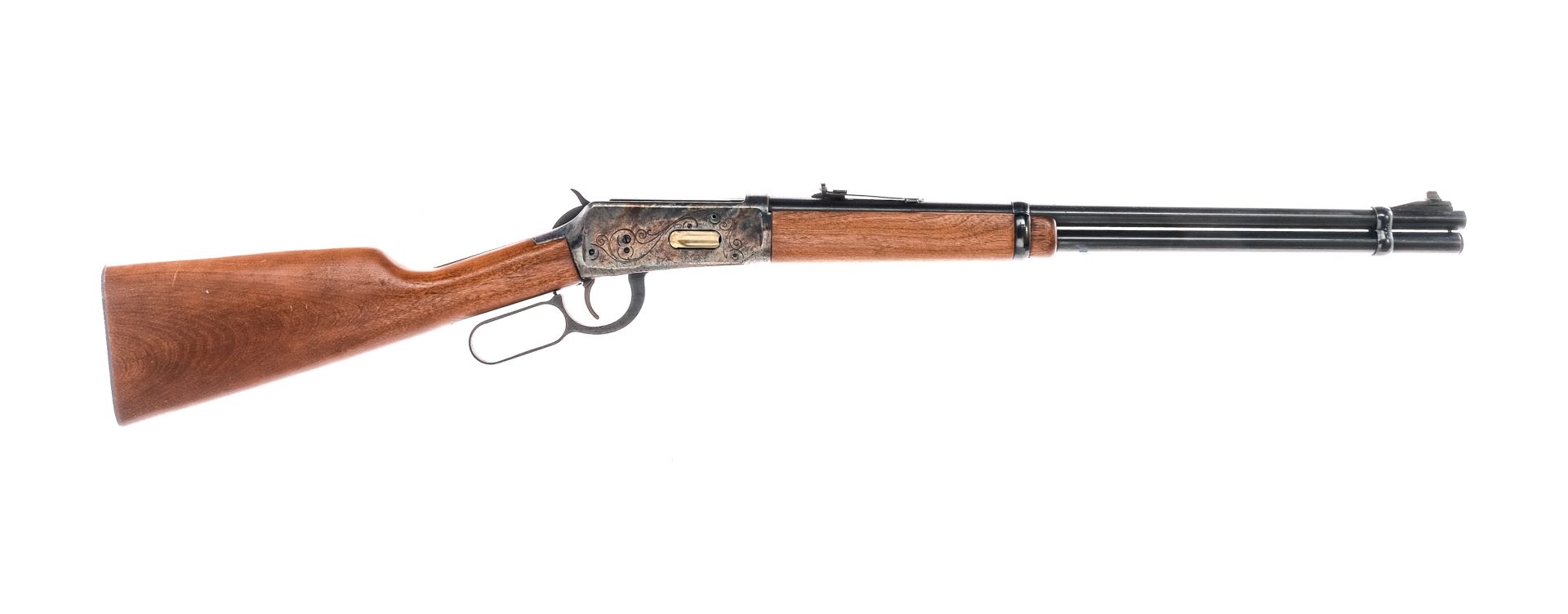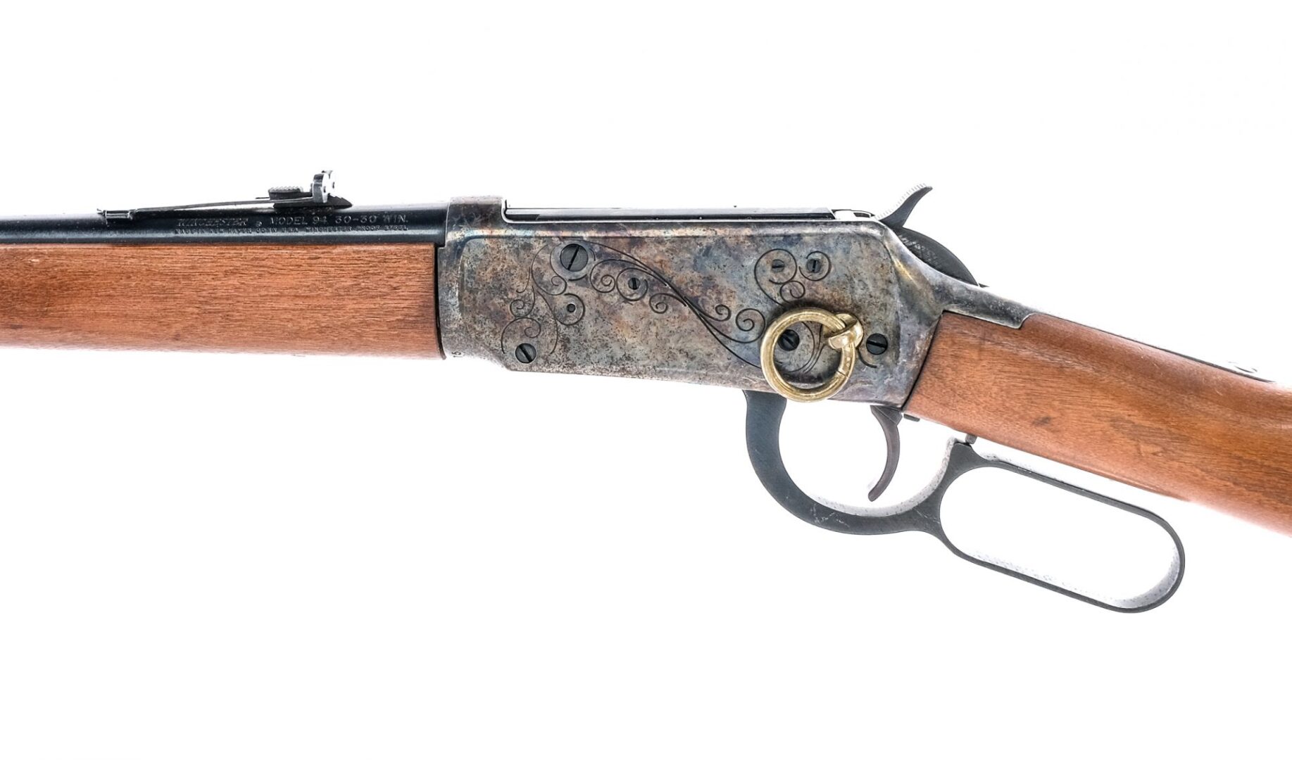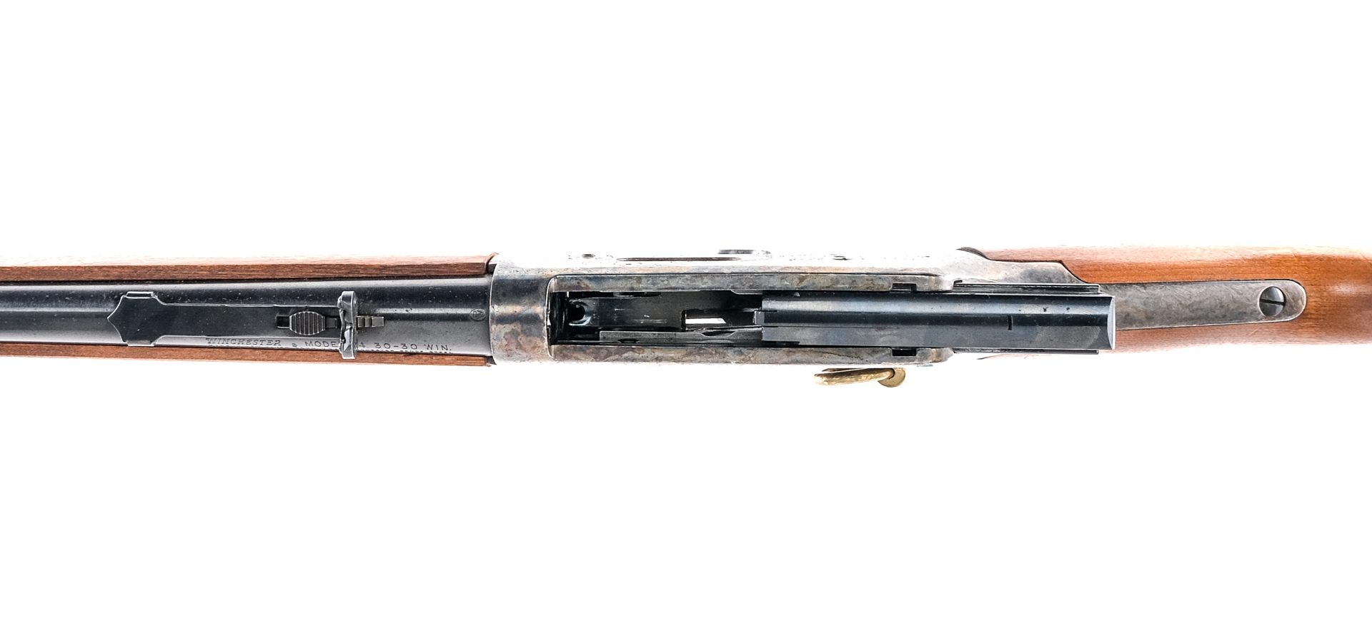 Description Winchester 94 chambered in .30-30 Winchester with a internal tube magazine and a 20″ barrel. Blued barrel, magazine tube, lever, ribbed trigger, and hammer. Case colored engraved receiver. Gold plated loading gate and saddle ring. Smooth wood forend and stock with composite butt plate. Buckhorn rear and hooded front sights. Must ship to FFL or C&R holder. Condition: Good light scratches and handling wear. Light speckling of metal oxidation on most external metal parts. Patina on receiver and gold plated parts. The wood has some light scratches and dings. The front forend is slightly lose and has a little bit of play. The bore has some light spots of stains/rust with good visible rifling. Barrel Length: 20″ Serial: 3159475 Manufacturer: WINCHESTER Year: 1968 Caliber: .30-30 Winchester Model: 1894 Book# 01032