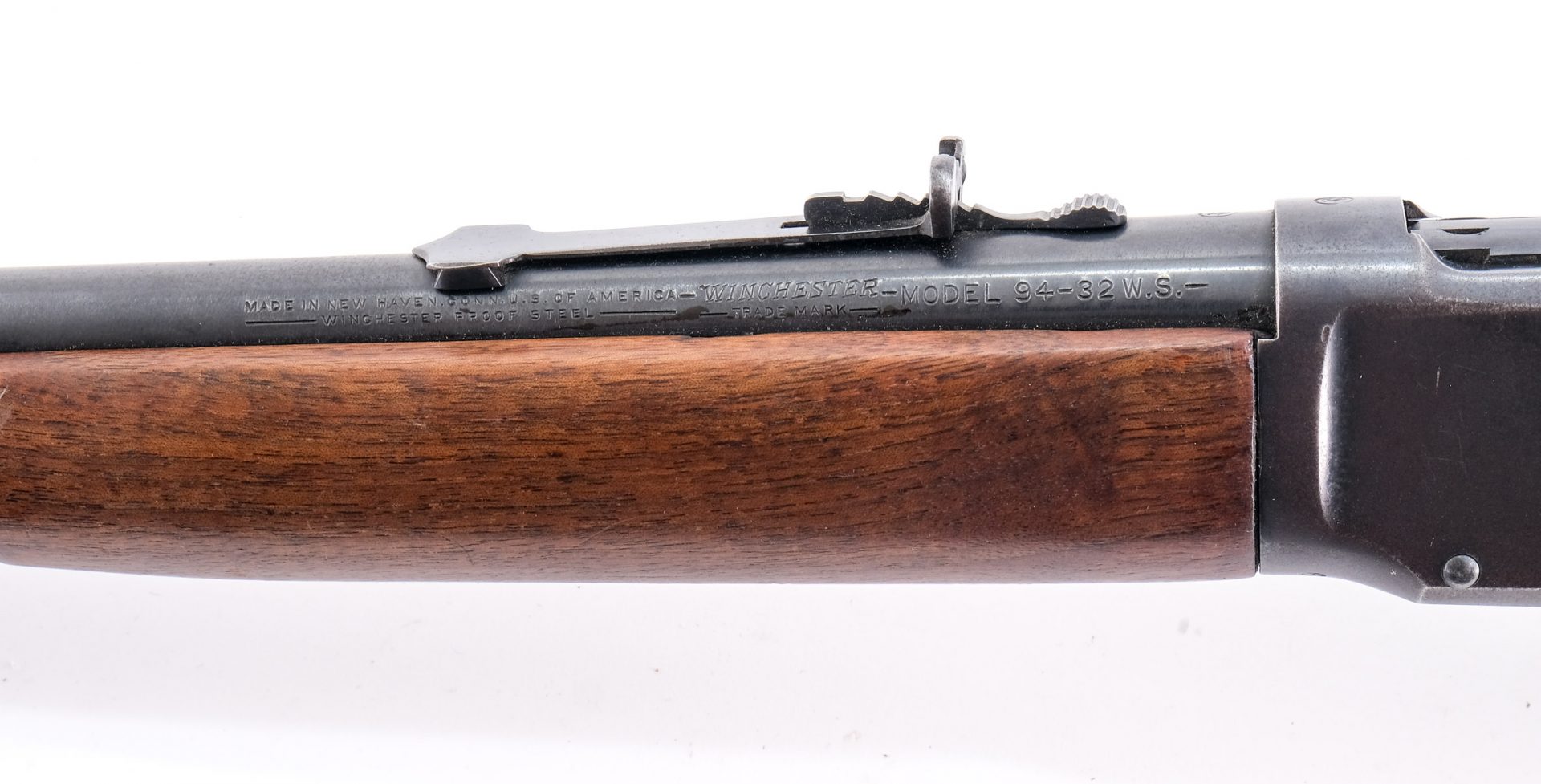 Description Winchester model 94 .32 W.S. (Winchester Special) with a five round capacity and a 20″ barrel. Checkered metal butt plate. Solid wood butt stock and front foregrip. Blued receiver, lever, trigger, barrel and magazine tube. Adjustable rear sight and front hooded fixed blade. Marked WP (Winchester Proof) on the barrel and receiver. Marked “D” under the receiver in front of trigger. Must ship to a C&R or FFL holder.