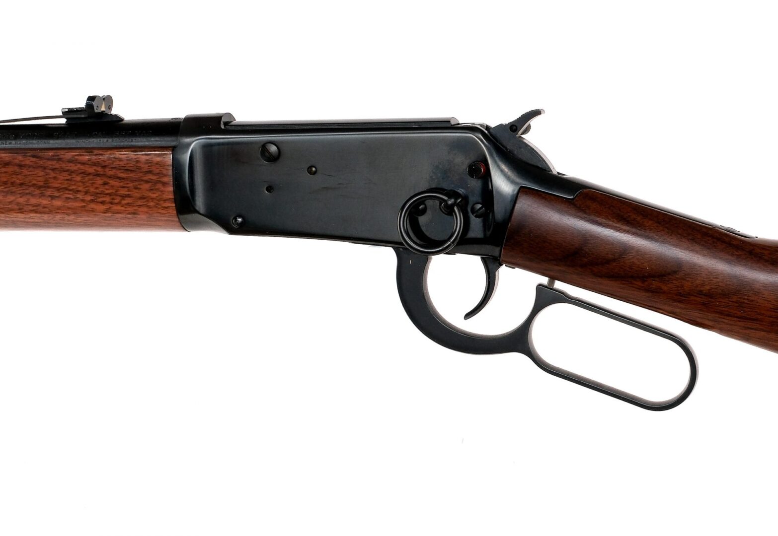 Description Winchester 94AE chambered in .357 Magnum with a nine round tubular magazine and a 16″ barrel. Blued barrel, magazine tube, barrel bands, receiver, loading gate, saddle ring, bolt, lever, trigger, and hammer with extension. Cross bolt safety selector. Adjustable rear buckhorn sight and fixed front blade. Smooth wood forend and straight stock with checkered composite butt plate. Must ship to a FFL holder. Condition: Very Good with light scratches and wear on the finish/wood from normal handling/operation. Bright and clean bore with strong rifling. Barrel Length: 16″ Serial: 6240357 Manufacturer: WINCHESTER Caliber: .357 Magnum Model: 94AE Book# 04384