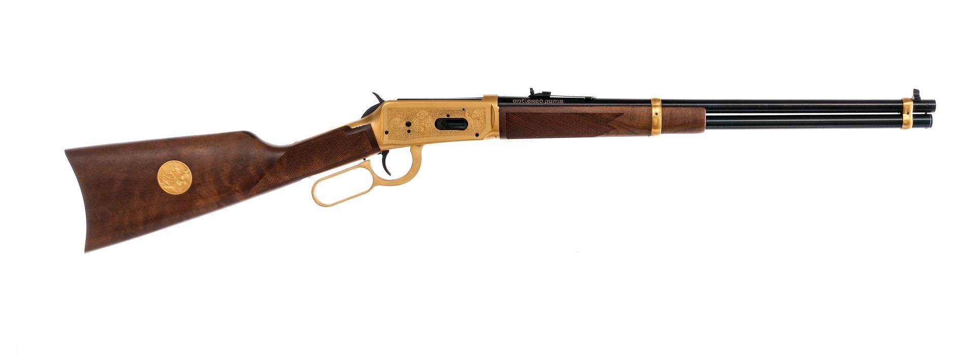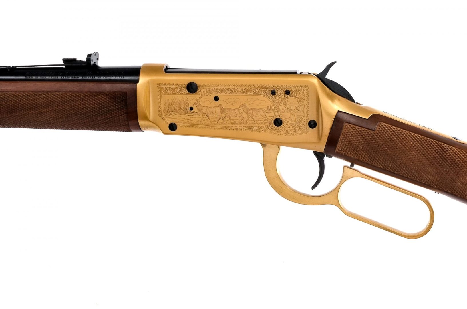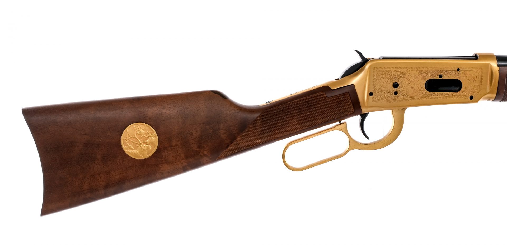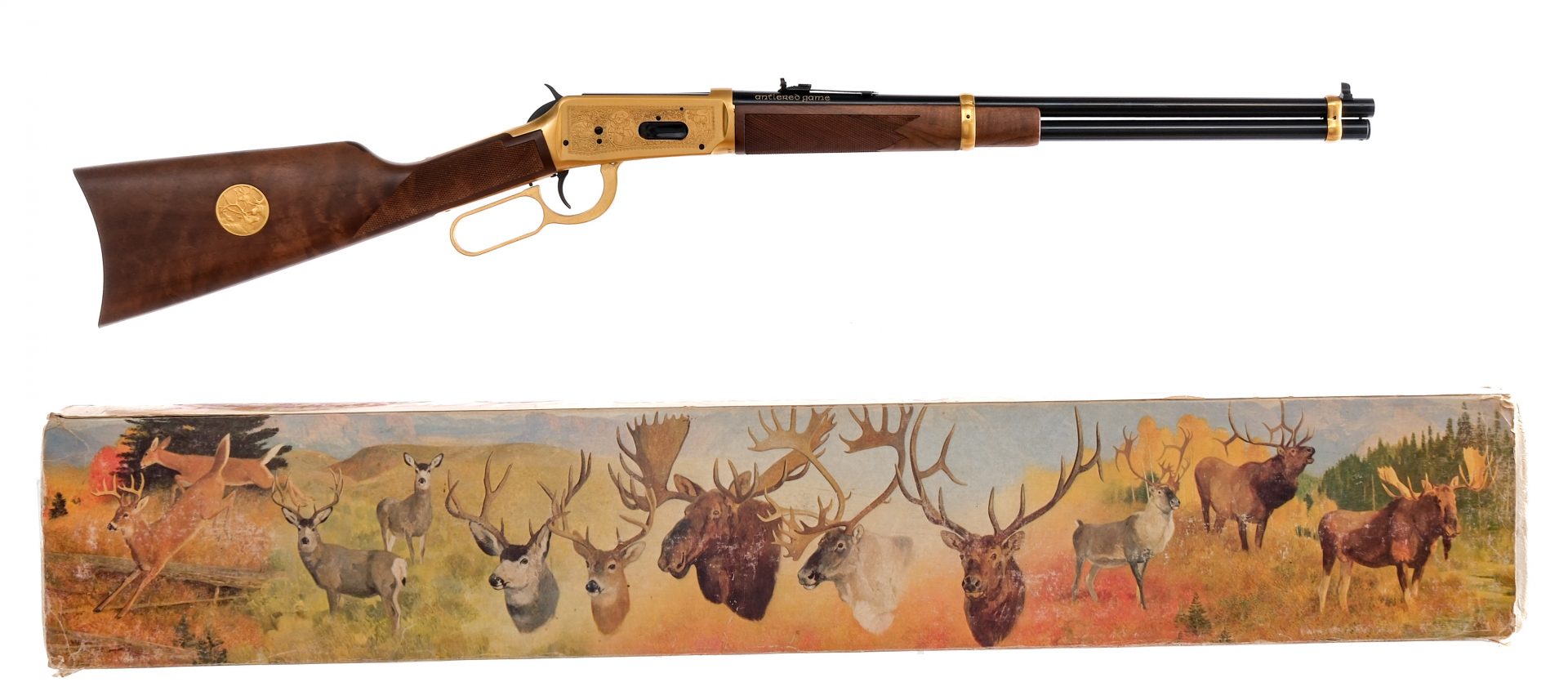 Description Winchester 94 Antlered Game chambered in .30-30 Win with a five round tube magazine and a 20″ barrel. Manufactured in 1978 with serial number AG15971. Blued barrel, magazine tube, hammer, and trigger. Brass/gold finished barrel bands, engraved frame, and lever. Checkered walnut forend and straight stock with inlayed coin and blued crescent butt plate. Adjustable buckhorn rear sight and fixed front blade. Comes in its factory box with paperwork. Must ship to a FFL or C&R holder. Condition: Very good/Excellent showing very little signs of use and light handling wear. Spots of metal oxidation/tarnish on the gold finish. Clean bore with strong rifling. Barrel Length: 20″ Serial: AG15971 Manufacturer: WINCHESTER Year: 1978 Caliber: .30-30 Winchester Model: 94 Antlered Game Book# 05177