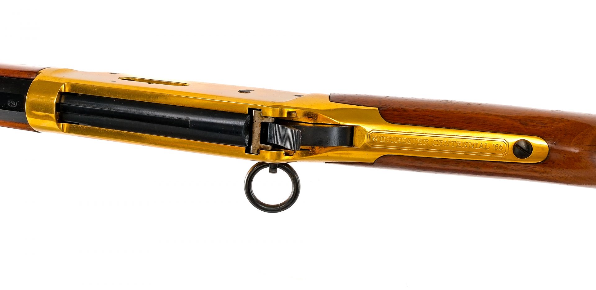 Description Winchester 94 Centennial 66 chambered in .30-30 with a full length tube magazine and a 26″ octagonal barrel. Manufactured in 1966 with serial number 13002. The right side of the barrel is marked “A Century of Leadership 1866-1966. Blued barrel, magazine tube, hammer, saddle ring, loading gate, trigger, and lever. Brass forend cap, frame, and crescent butt plate. Smooth wood forend and straight stock. Adjustable rear buckhorn and fixed front blade sight. Must ship to a FFL or C&R holder. Condition: Good/Very Good with scratches and wear from handling, operation, and storage. Varying spots and speckling of rust/metal oxidation on most of the metal parts. Heavier metal oxidation on and around the muzzle. Some tarnish/patina on the brass finish, heavier on the butt plate. Scratches and dings in the wood. The bore is bright and mostly very clean, aside from a touch of rust near the muzzle. Strong visible rifling. Barrel Length: 26” Serial: 13002 Manufacturer: WINCHESTER Year: 1966 Caliber: .30-30 Winchester Model: 94 Centennial 66 Book# 04707