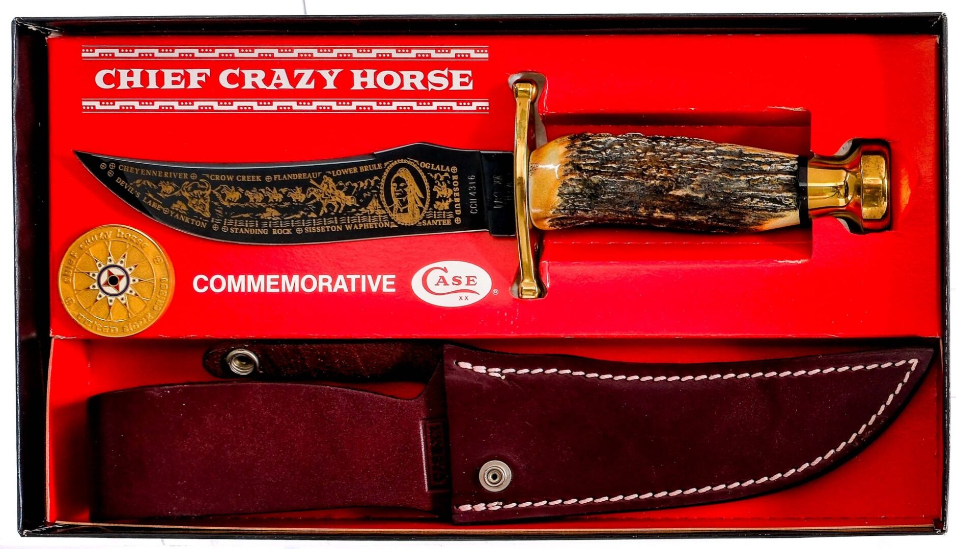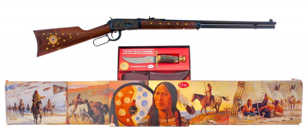 Description Winchester 94 Chief Crazy Horse Commemorative chambered in .38-55 with a full length magazine tube and a 24″ barrel. Blued barrel, magazine tube, trigger, hammer, lever, loading gate, butt plate and saddle ring. Case colored engraved receiver and barrel band. Smooth walnut forend and butt stock with brass tacks. Right side of the stock has a Crazy Horse medallion. “Chief Crazy Horse” engraved on the right side of the barrel with gold colored inlay. Rear adjustable buckhorn and fixed front iron sights. Comes in its factory box with matching serial number and factory paperwork. Also comes with the serial number matching Chief Crazy Horse Commemorative engraved knife with stag grip, manual, leather sheath, and Crazy Horse medallion. Must ship to a FFL or C&R holder. Condition: Like new showing light handling wear and appearing to have seen little to no use. Some of the brass has oxidization/tarnish. Bright clean bore with strong rifling. The knife is also like new condition. Barrel Length: 24″ Serial: CCH4316 Manufacturer: WINCHESTER Year: 1983 Caliber: .38-55 Winchester Model: 94 Chief Crazy Horse Commemorative Book# 02787