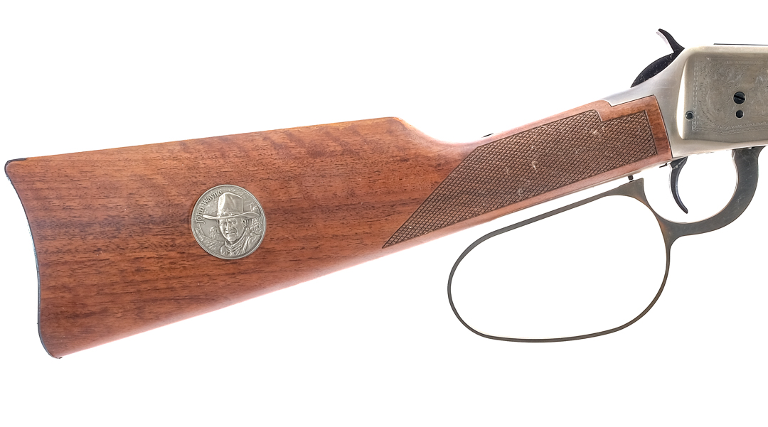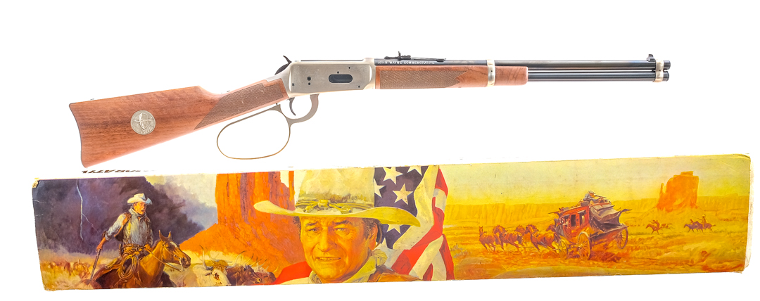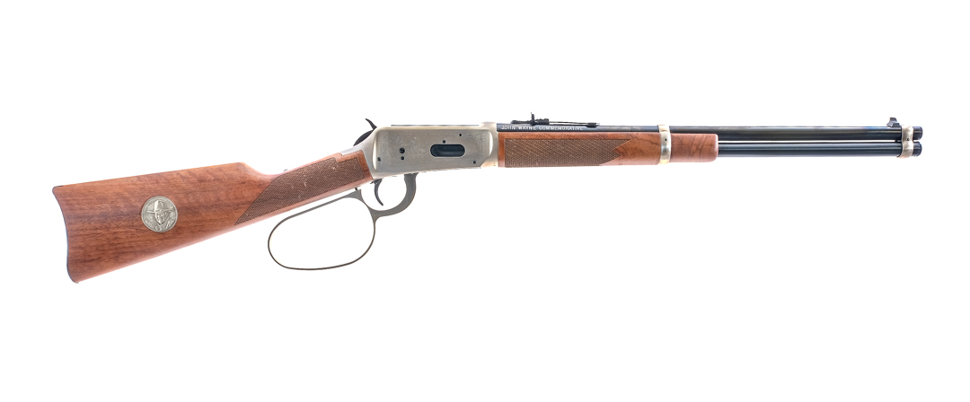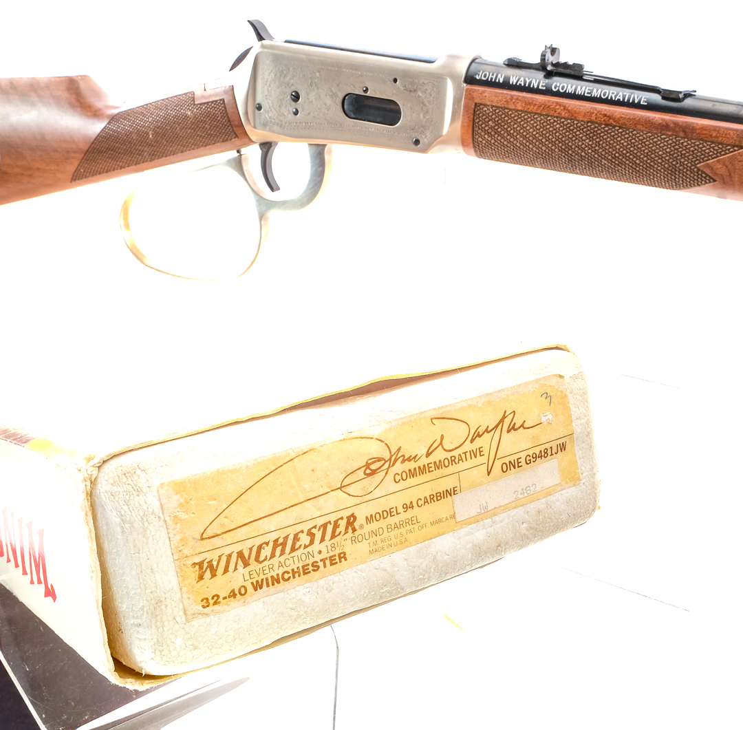 Description Winchester 94 John Wayne Commemorative chambered in .32-40 Winchester with a five round tube magazine and a 18.5″ barrel. Blued barrel, magazine tube, trigger, and hammer. Antique silver finished engraved frame and large loop lever. Checkered walnut forend and stock with carbine-style butt plate. Receiver mounted saddle ring and John Wayne medallion on the right side of the stock. Rear adjustable buckhorn and front fixed iron sights. “John Wayne Commemorative” engraved on the right side of the barrel with silver inlay. John Wayne’s signature engraved on the tang. Comes in its factory box with matching serial number, factory paperwork, and leather thong. Must ship to FFL or C&R holder. Condition: Like new, does not appear to have been fired but has spots of patina/metal oxidation from poor storage. The saddle ring has been removed and is heavily rusted. The toe of the stock near the butt plate has a crack. Very clean rifled bore. Barrel Length: 18.5″ Serial: JW2482 Manufacturer: WINCHESTER Year: 1981 Caliber: .32-40 Winchester Model: 91 John Wayne Commemorative Book# 9-569