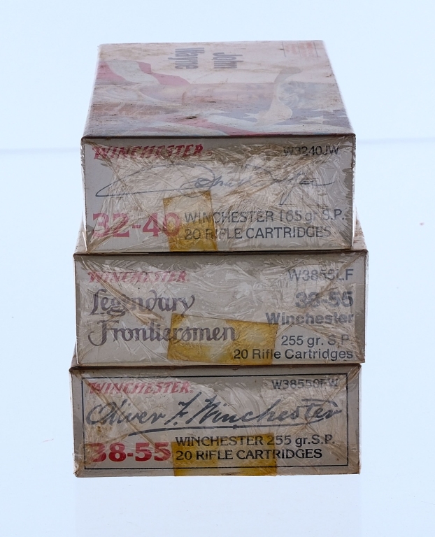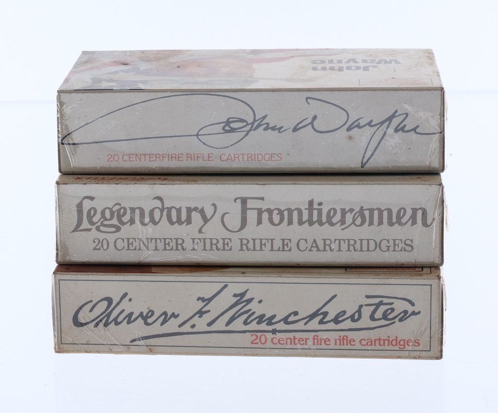 Description This lot is for three different sealed boxes of Winchester Commemorative lever action ammunition. First is one, twenty round box of John Wayne commemorative .32-40 Winchester 165 grain soft point ammunition. The second box is one, twenty round box of Legendary Frontiersman .38-55 Win 255 grain soft point ammunition. The third and final box is one, twenty round box of Oliver F. Winchester .38-55 255 grain soft point ammunition. Ammunition ships directly to buyers home where legal. Condition: New old stock, sealed unfired ammunition. Light handling, storage wear, and stains on the boxes/seal. SOLD AS-IS. Manufacturer: Winchester, Olin Corp Caliber: .32-40, .38-55 Model: John Wayne, Legendary Frontiersman, Oliv