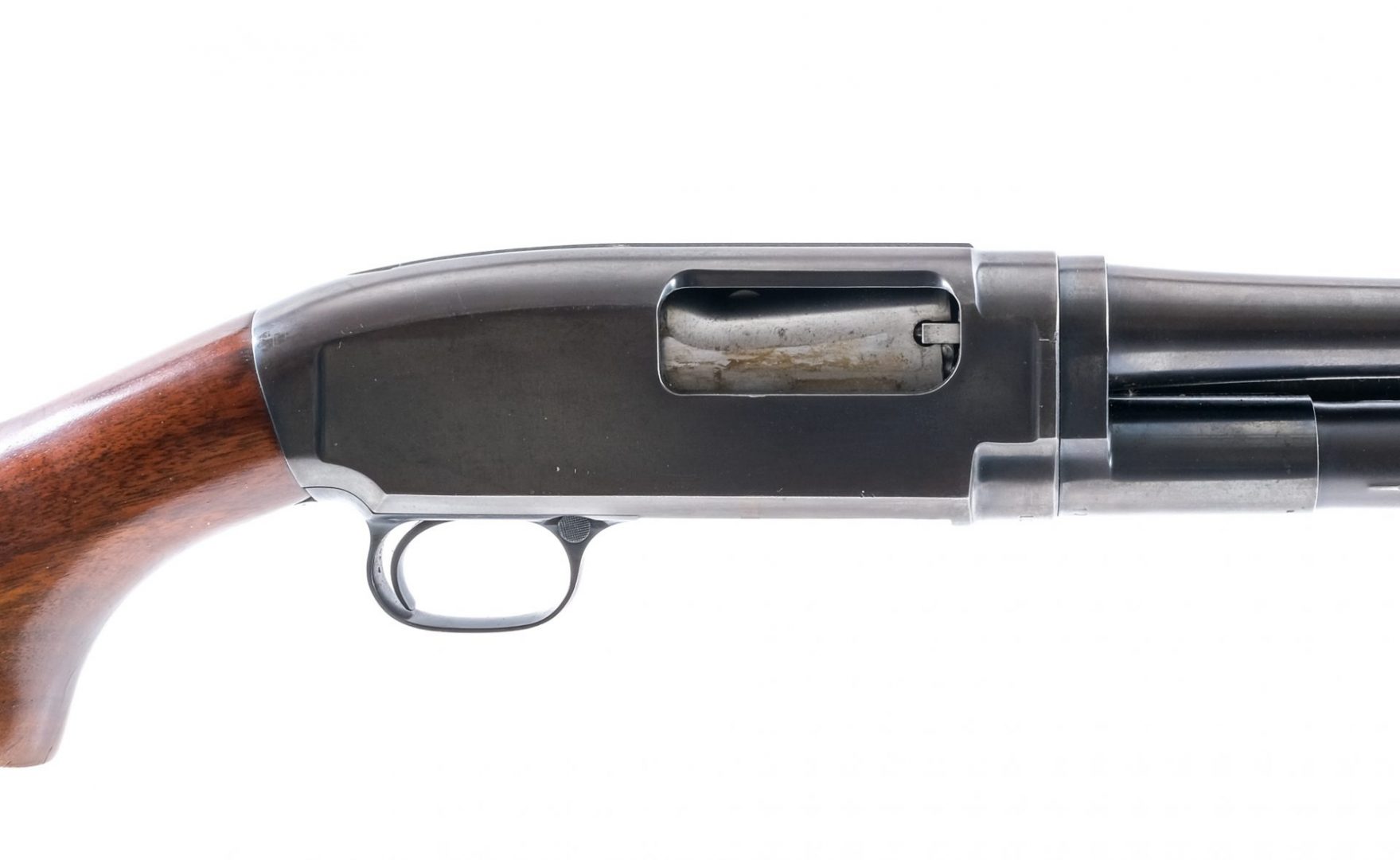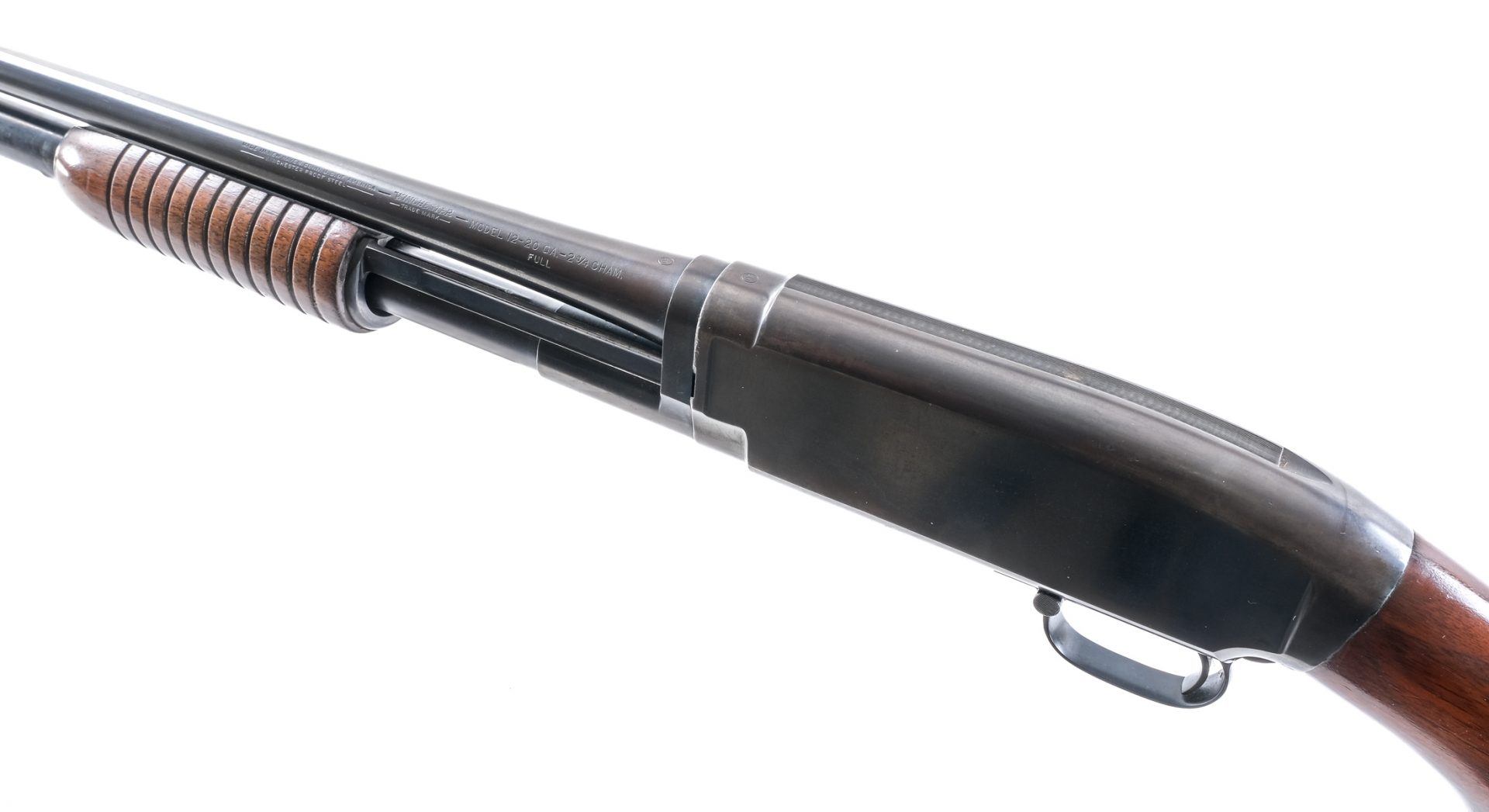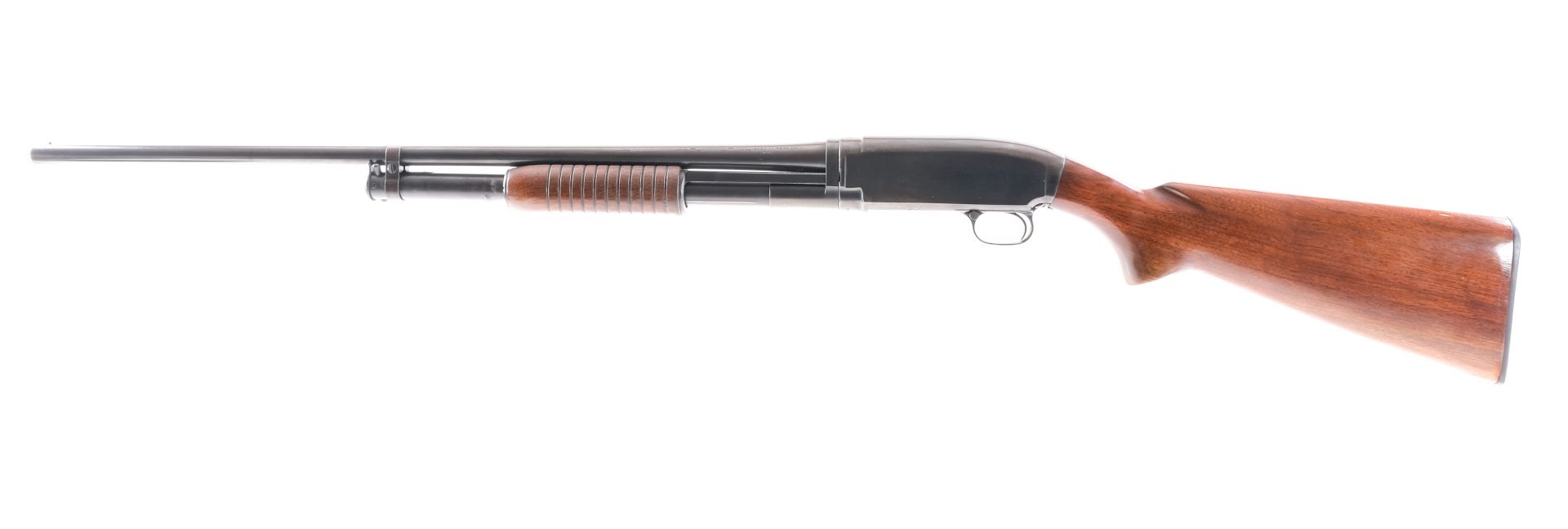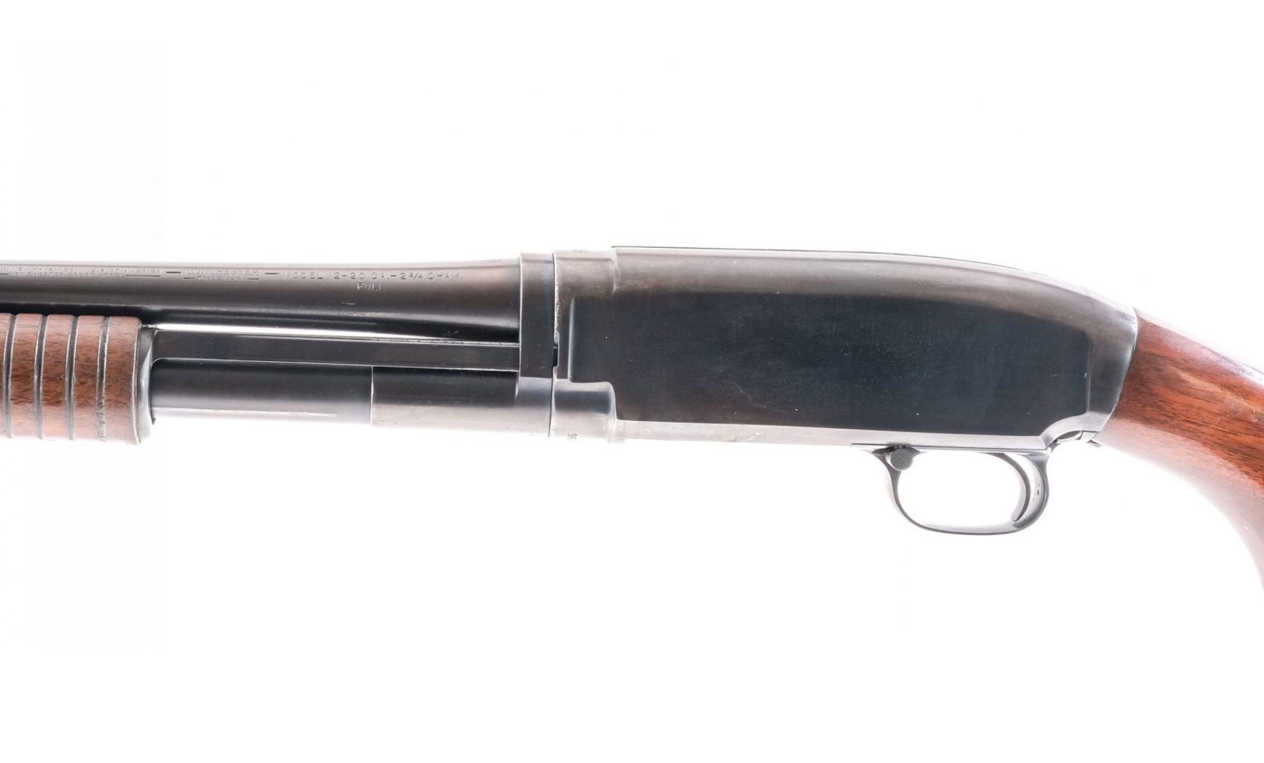 Description Winchester model 12, 20 gauge pump shotgun chambered for 2-3/4″ shells. This example with serial number 1093496 and dating to 1915 features a 28″ single beaded barrel choked FULL, blued finish, smooth butt stock and ribbed forearm. LOP=14″, DOC=1-3/8″, DOH=2-1/4″, OAL=46-3/4″ and weight is 6.4 lbs. Ships to FFL/C&R only.