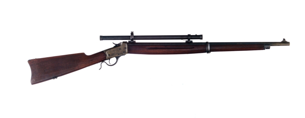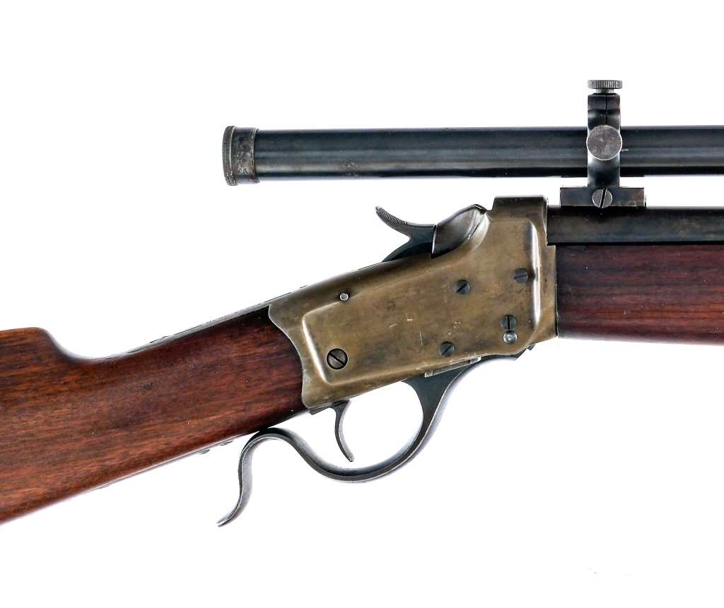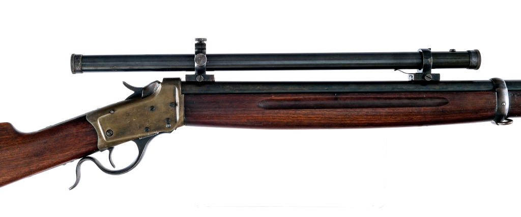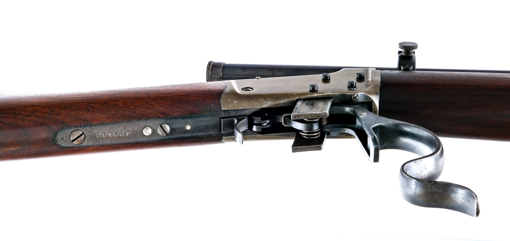 Description US Marked Winchester 1885 “Winder Musket” chambered in .22 long rifle with a single-shot capacity and a 28″ barrel. Lever actuated low wall falling block action. Serial number 124148. Blued barrel, receiver, hammer, lever, and trigger. Front blade sight. The rear sight has been removed and a J. Stevens scope has been mounted. The scopes serial number is 338. Smooth wood forend and straight grip stock with metal butt plate. Front and rear sling swivels. “US” and Flaming Bomb proof is marked on the tang. Must ship to a FFL or C&R holder. Condition: Very good-Excellent antique grade with light scratches, sharp edge wear and general cosmetic handling. Light wear on the internal and operational parts from normal use. Spots of finish patina and metal oxidation. The stock appears to have been cleaned. Light scratches and dings on the wood. Bright and clean bore with strong visible rifling. Some spots of metal oxidation on the scope. Barrel Length: 28″ Serial: 124148 Manufacturer: WINCHESTER Caliber: .22 Long Rifle Model: 1885 “Winder Musket” Book# 08375