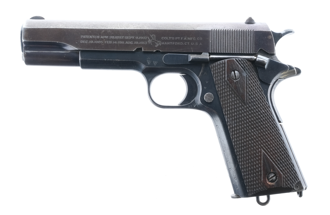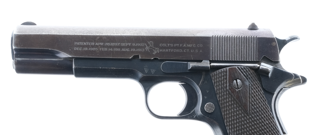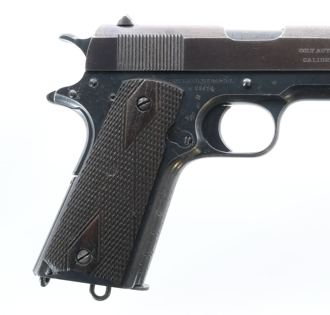 Description WW1 Colt British Contract M1911 semi auto pistol chambered in .455 Webley. Identified by the “W” prefix in the serial number for Webley which reads “W99896” and the legend on the slide which reads “COLT AUTOMATIC / CALIBRE 455” these British contract pistols began production at Colt in 1916 to satisfy the inability of Webley to produce needed pistols in .455 Webley cartridge. Since .455 Webley and .45 ACP are so close dimensionally it was a no brainer for Colt to satisfy the needs of our close ally. This example dates towards the end of production and exhibits most of the characteristics expected including the lanyard loop magazine marked “CAL .455 / ELEY” on the floor plate. Internal are marked “E” and the barrel has British proofs on the outside of the chamber. Ships to FFL/C&R Only. Condition: VERY GOOD showing a large percentage of original finish but considerable thinning on the high spots indicative of use. There are several nicks in the frame especially around the takedown pins. The front grip strap has been randomly stippled though not too extreme. The diamond checkered grip panels are in nice condition with minimal wear. The bore is slightly frosted but retains good rifling. Barrel Length: 5″ Serial: W99896 Manufacturer: Colt Year: 1918 Caliber: .455 WEBLEY Model: 1911