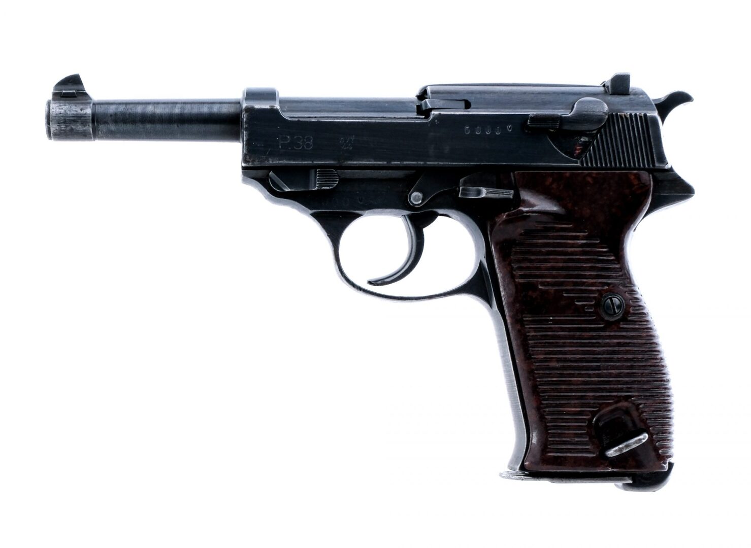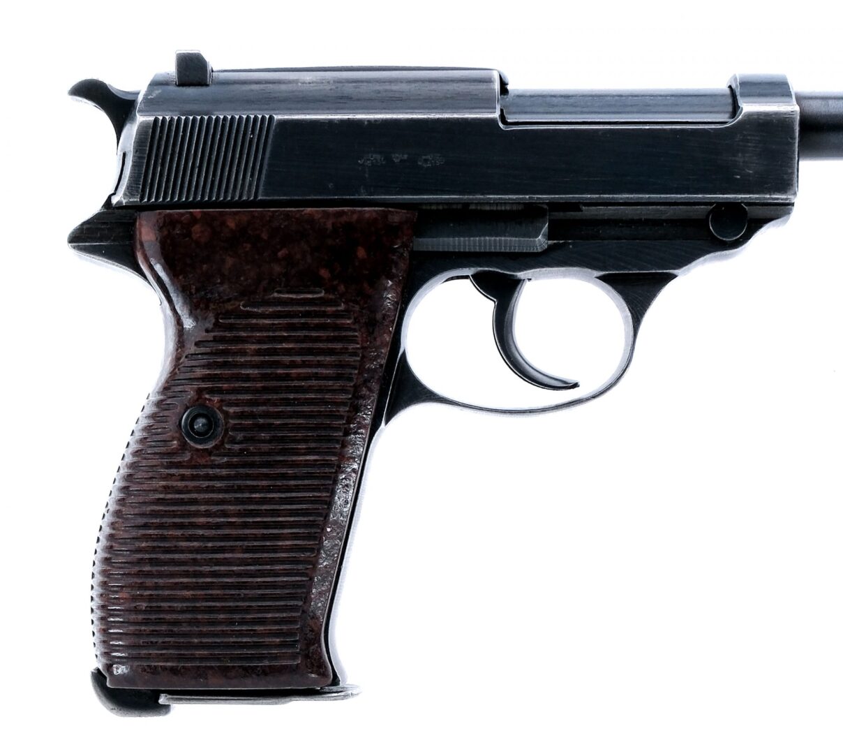 Description World War II German Mauser BYF code P38 chambered in 9mm with one, eight round removable magazine and a 4.9″ barrel. Manufactured in 1944 with serial number 6000V. Blued steel frame with ribbed Bakelite grips and lanyard loop. Serrated heel magazine release, slide stop, and take down lever. Double/single action trigger and exposed hammer. Blued barrel and serrated slide with mounted safety/de-cocker. Fixed iron sights. Matching serial number frame, slide, and barrel. WaaA135 Waffenamt is stamped on the left side of the frame, left side of the barrel, and twice on the right side of the slide with Third Reich Eagle stamp. The left side of the frame is stamped “P.38” AND “byf44”. The magazine is stamped “P38 V”. Must ship to a FFL or C&R holder. Condition: Good/Very Good with normal scratches, scuffs, and general handling wear. Finish patina/loss mainly on the frame, edges, moving parts, and contact points. Varying spots of metal oxidation, mostly small spots with the most of it being on the side of the slide. Very bright and clean bore with strong visible rifling. Barrel Length: 4.9″ Serial: 6000V Manufacturer: MAUSER Caliber: 9x19mm Parabellum Model: P38 Book# 05406