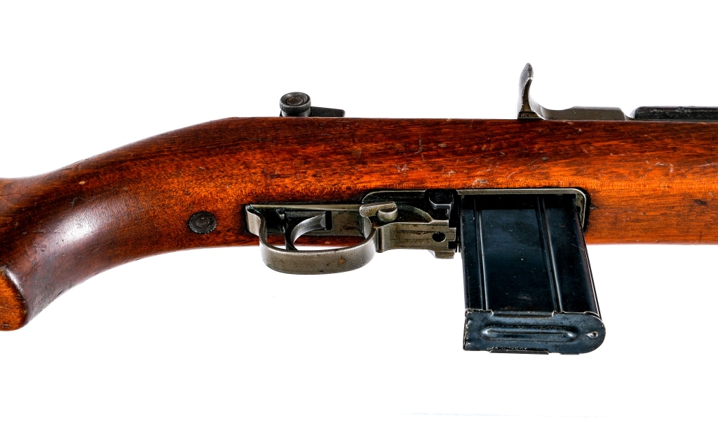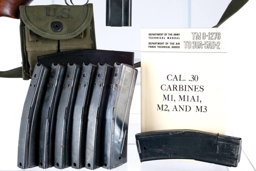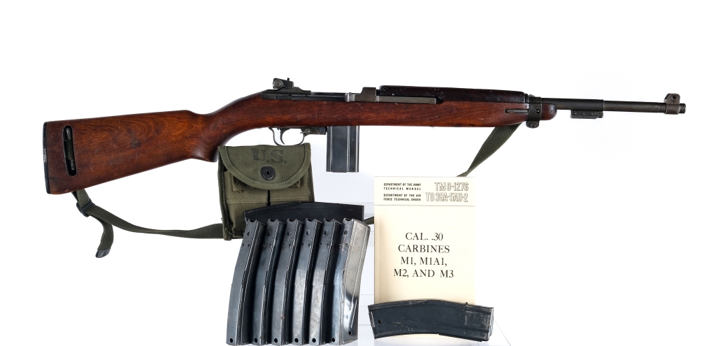 Description World War II IBM Corp M1 Carbine chambered in .30 Carbine with eleven total magazines and a 18″ IBM barrel. Manufactured in 1943 with serial number 3680655. The barrel is also dated to 1943 and marked “I.B.M. CORP. 9 – 43” over a flaming bomb proof. Protected front blade sight and Adjustable rear peep sight. Type 3 front barrel band with bayonet lug and sling loop. Straight belly stock with low wood and oval oiler cut with oiler. Early two rivet top handguard. Blued round body bolt. Push button magazine release and later rotary safety. Parkerized finish. The left side of the stock is stamped with a “U” and matching serial number. The right side of the stock has a faded Cross Cannons cartouche. The magazines included are eight, thirty round magazines, and three, fifteen round magazines. Also comes with technical manual and a green canvass magazine pouch with the outside of the flap marked “U.S.” and the inside of the flap marked “AVERY 1945”. Must ship to a FFL or C&R holder. Check local laws regarding “High Capacity” magazines BEFORE bidding. Condition: Good/Very good with scratches, sharp edge wear, and general cosmetic handling wear. Normal wear on the moving/internal parts from operation. Spots of finish darkening, thinning, and general patina on the metal parts. Some spots of metal oxidation. Some parts of the wood may have been cleaned with some marking being dull and some being sharp. Scratches, scuffs, and dings on the wood. The bore is bright with some small spots of metal oxidation, strong visible rifling. Barrel Length: 18″ Serial: 3680655 Manufacturer: INTERNATIONAL BUSINESS MA Year: 1943 Caliber: .30 Carbine Model: M1 Carbine Book# 08293