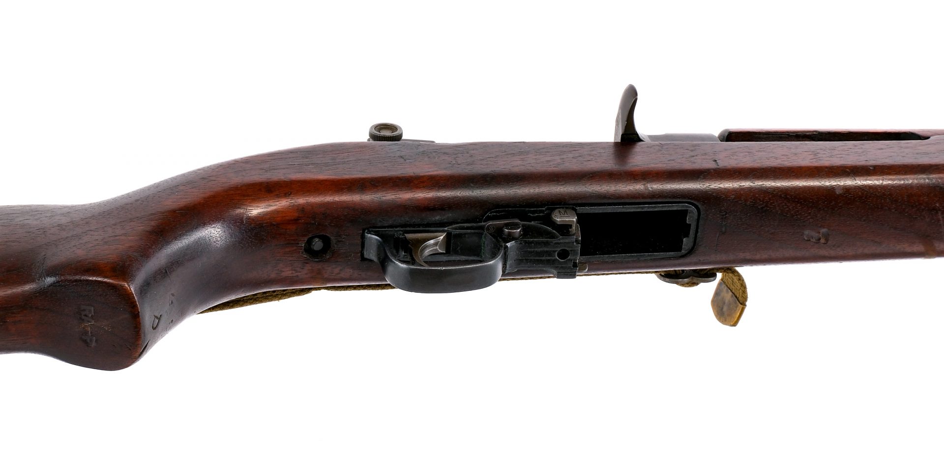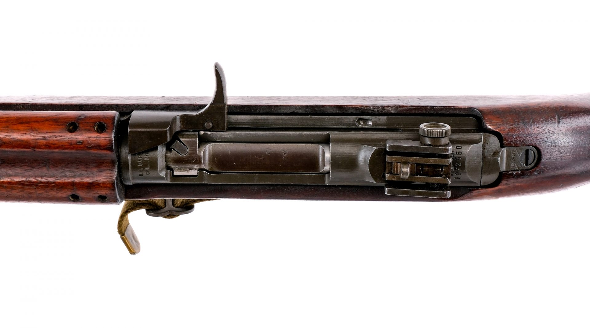 Description World War Two Rock-Ola M1 Carbine chambered in .30 Carbine with a 18″ Rock-Ola barrel. Manufactured in 1944 with serial number 6072560. Parkerized barrel with type 3 barrel band with bayonet lug and marked “J.M.O.”. Parkerized operating rod, receiver, flat top bolt, trigger guard, and trigger. Rotary safety and push button magazine release. Protected front blade sight and adjustable rear sight marked “PI”. Roc-Ola marked tang. Type 3 late straight wood stock with low wood and oval oiler slot. The bottom of the grip of the stock is marked “RA-P”, and the front of the grip is marked “P”. Wood four rivet top handguard. Mounted green canvas horseshoe tab sling. NO Magazine Included. Must ship to a FFL or C&R holder. Condition: Good/Very good with general scratches, contact marks, and wear from handling/operation. Spots of metal oxidation and finish patina/discoloration. Light wear on the wood, appears to have been sanded and refinished at some point. Bright and clean bore with strong visible rifling. Barrel Length: 18.5″ Serial: 6072560 Manufacturer: ROCK-OLA MANUFACTURING CO Year: 1944 Caliber: .30 Carbine Model: M1 Carbine Book# 04064