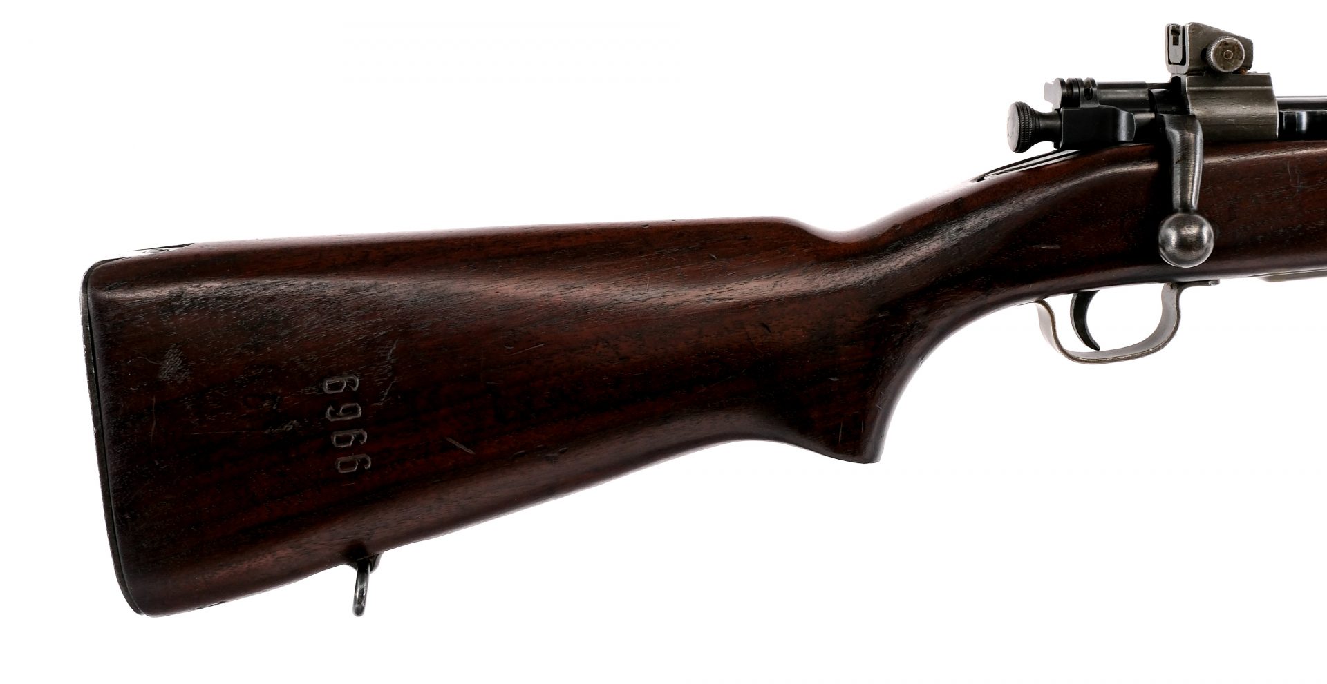 Description World War Two Smith-Corona 03-A3 chambered in .30-06 Springfield with a five round internal magazine and a 24″ SC barrel. The receiver is dated to 1943 with serial number 3618423. Parkerized barrel and barrel bands with bayonet lug. Parkerized receiver, floor plate, trigger, and trigger guard. Blued bolt with flag style safety. Magazine cutoff/bolt removal lever. Adjustable rear sight and fixed front blade. Smooth wood top forend and pistol grip stock with trap door butt plate. Front and rear sling swivels. The stock is non matching marked with 6966. The bottom of the grip is marked “L” and the forend “G”. The date and flaming bomb proof on the barrel is obscured. Must ship to a FFL or C&R holder. Condition: Good/Very good with scratches, sharp edge wear, and normal wear from handling and operation. Some finish patina/discoloration from age and storage. Some spots of metal oxidation and finish loss. Scratches and dings in the wood. Bright and clean bore with strong rifling. Barrel Length: 24″ Serial: 3618423 Manufacturer: SMITH-CORONA Year: 1943 Caliber: .30-06 Springfield Model: 03-A3 Book# 04094